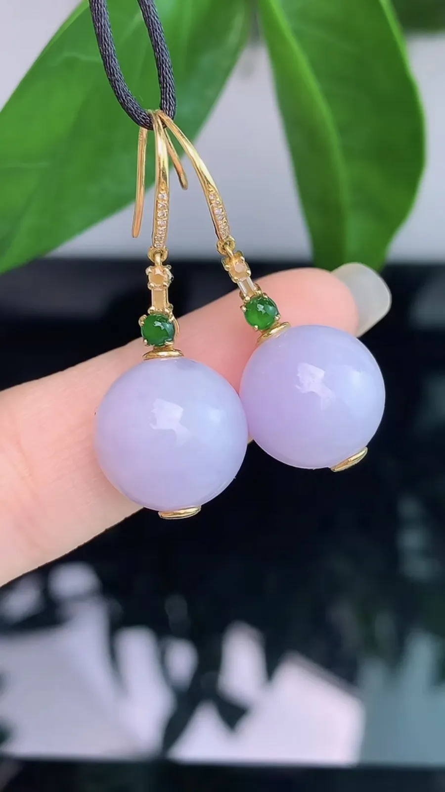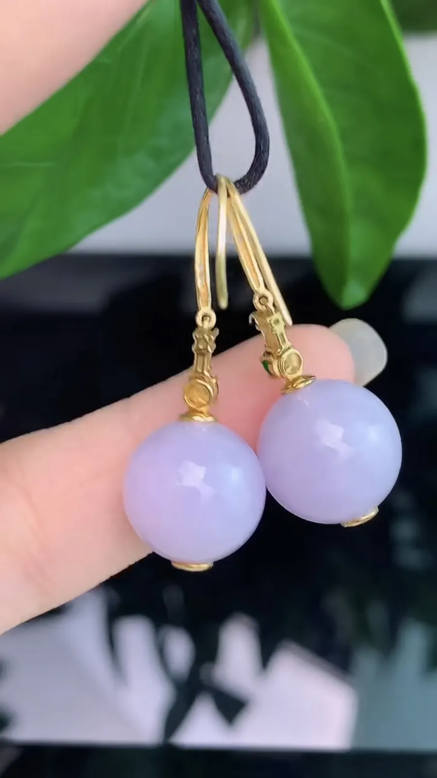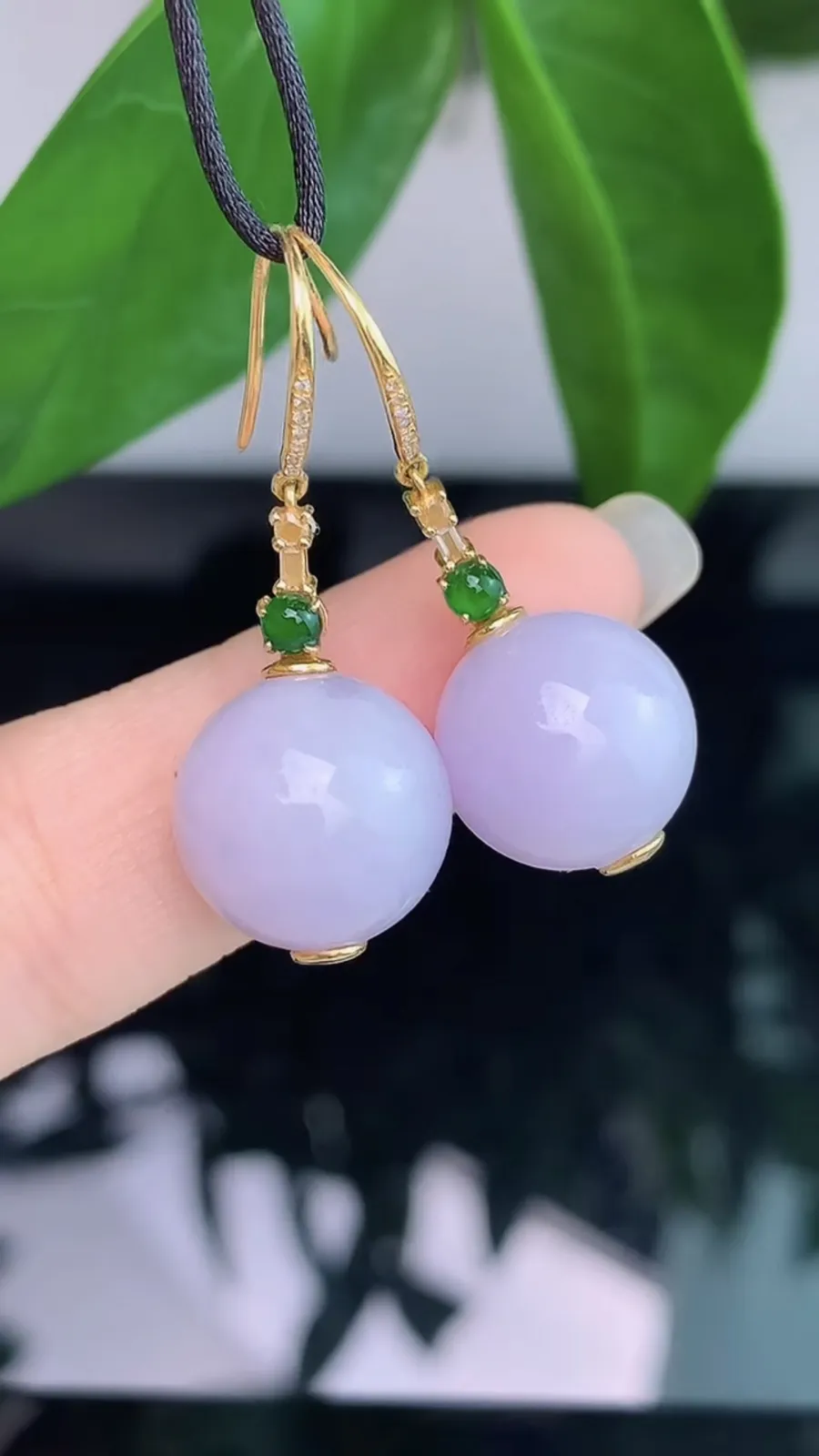 天然A货翡翠-18k金冰糯种紫罗兰胶感圆珠耳勾一对1013-281,尺寸取一12.6,重量7.60g