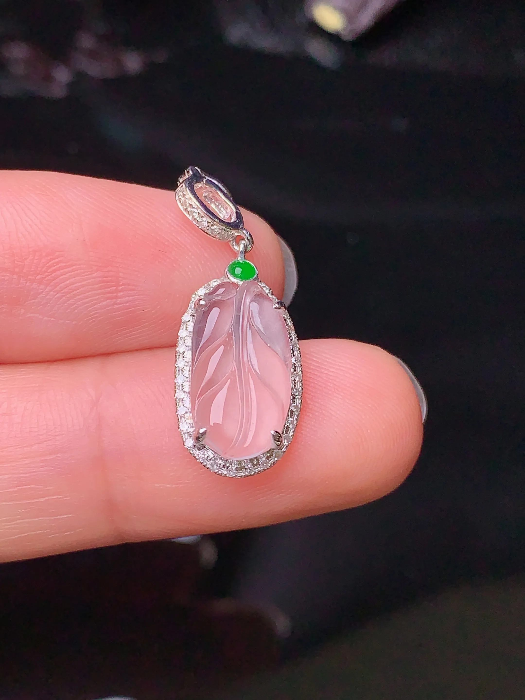 18k金钻镶嵌冰种树叶吊坠 玉质细腻 色泽艳丽 整体尺寸25.2*9.5*4