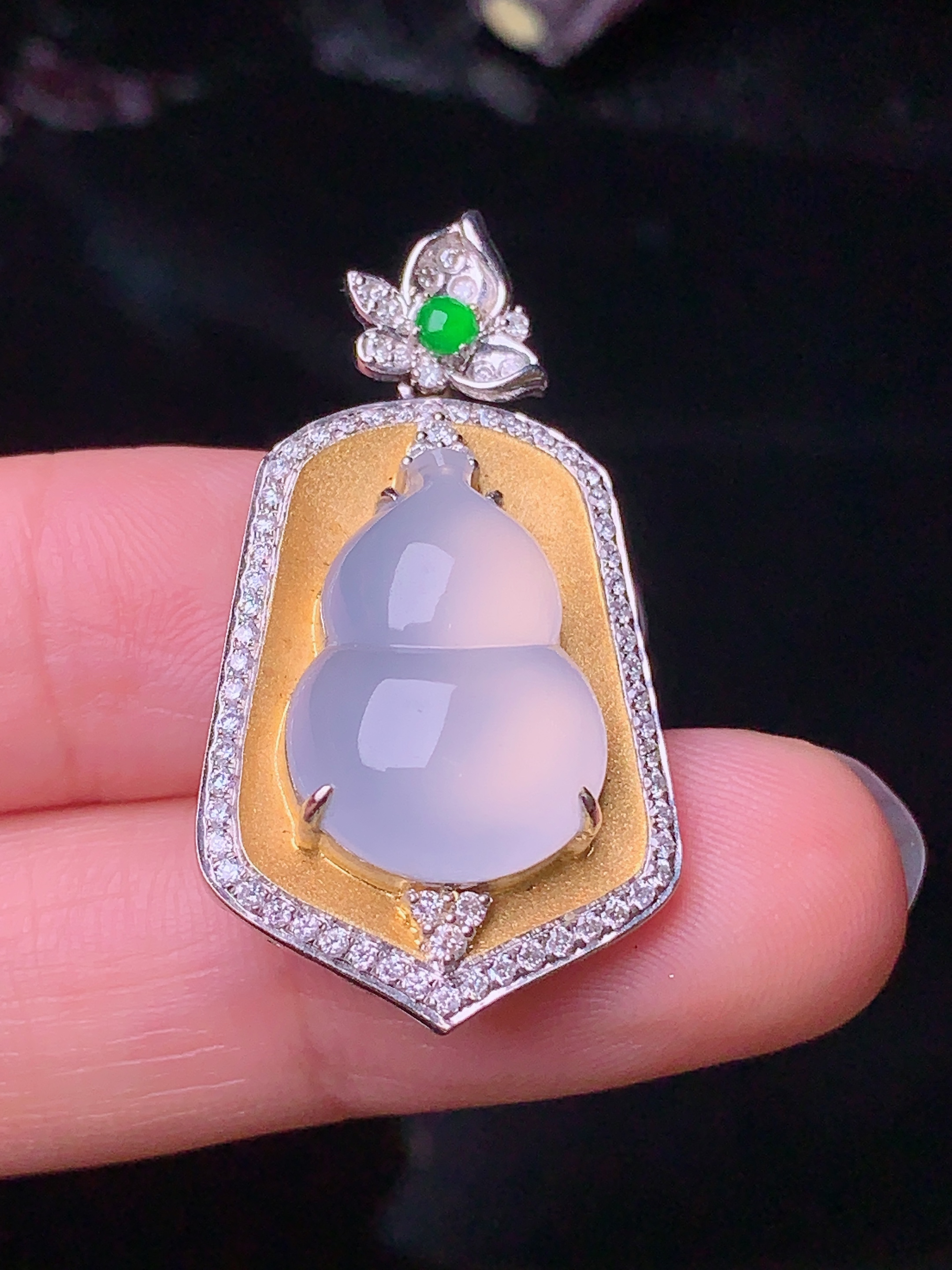 18k金钻镶嵌冰种葫芦吊坠 玉质细腻 色泽艳丽 整体尺寸24*18.5*9