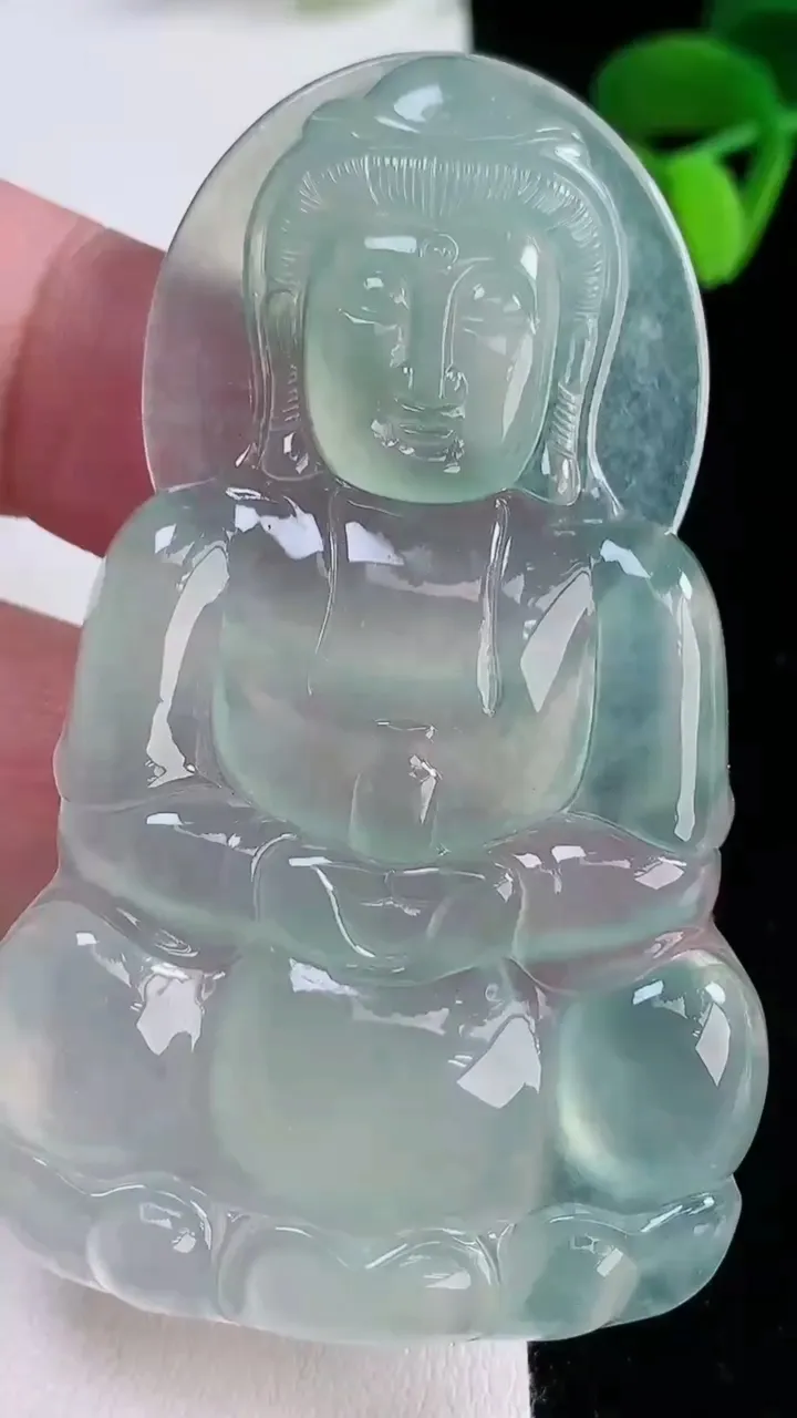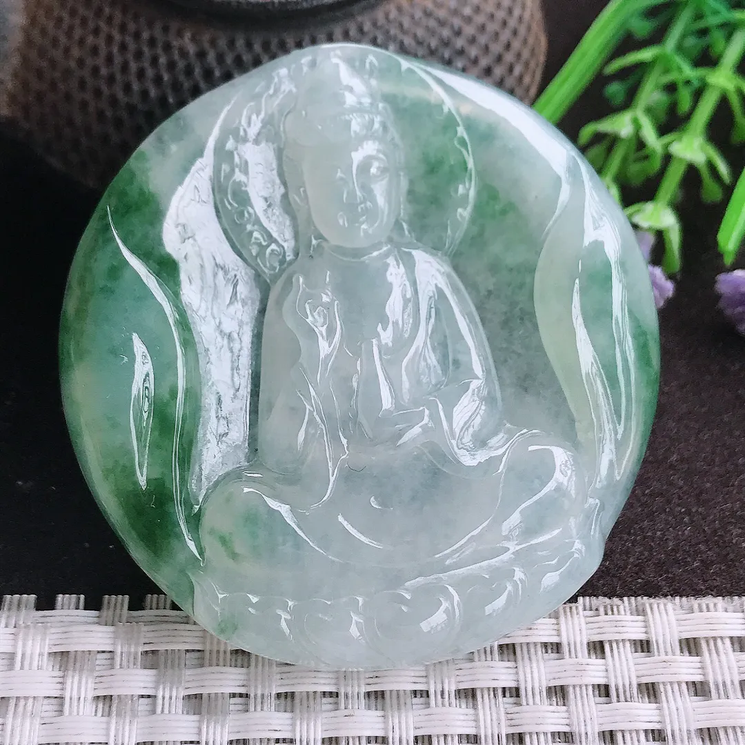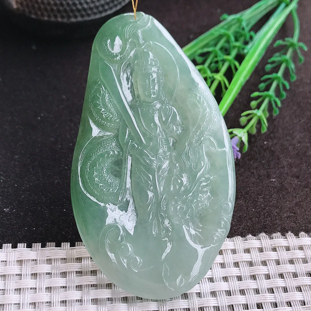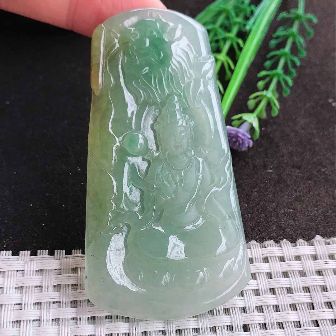 天然A货翡翠75/41/5老坑冰润起胶冰晴绿文殊菩萨吊坠翡翠挂件
