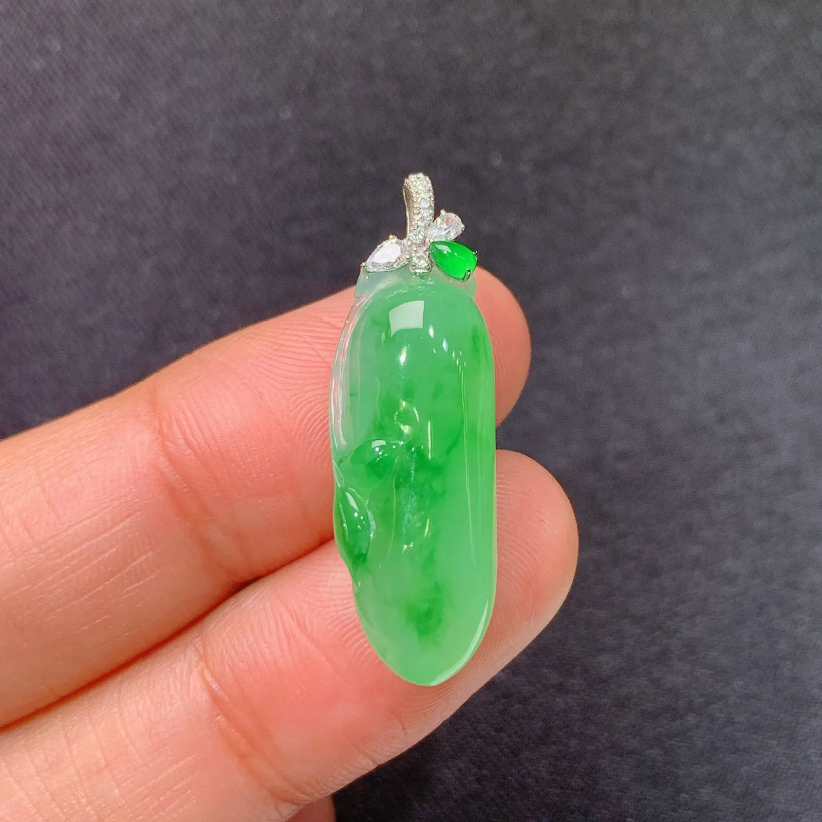 阳绿福豆吊坠,色泽均匀艳丽,玉质细腻,荧光感超 强,饱满圆润,尽显优雅气质,18k 金豪华镶嵌