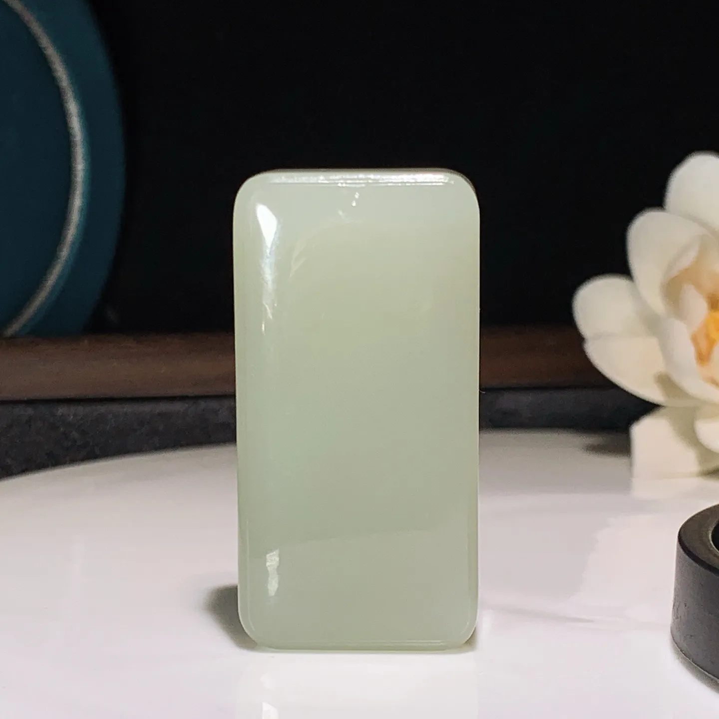 阳绿无事牌吊坠,色泽均匀艳丽,玉质细腻,荧光感超 强,饱满圆润,尽显优雅气质,18k 金豪华镶嵌