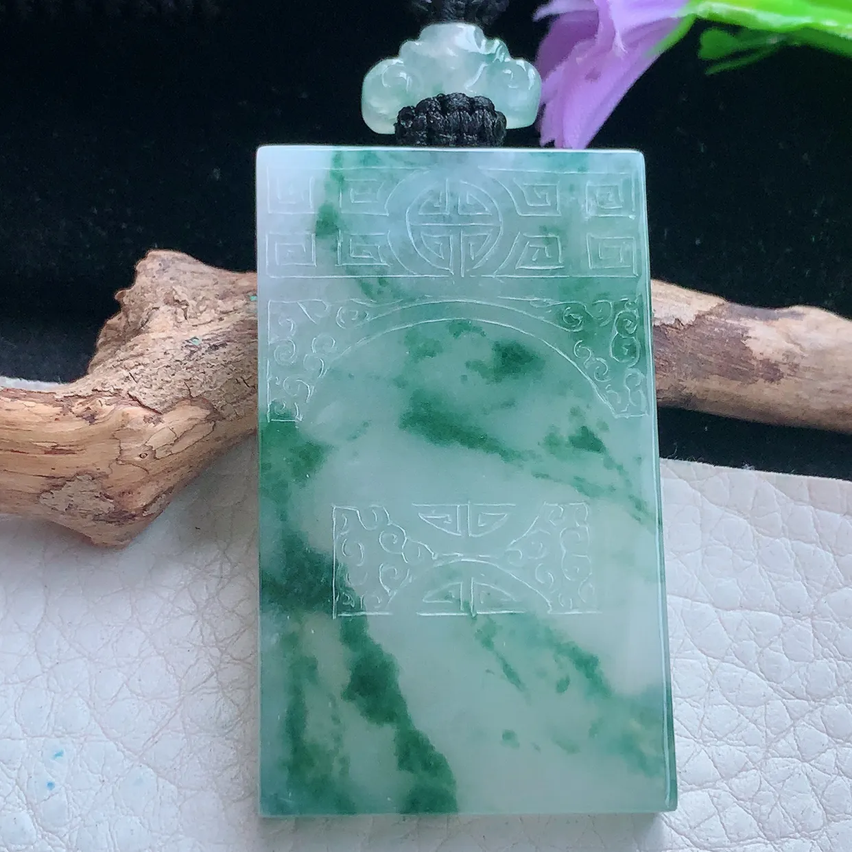 yl实拍49.8*30*6缅甸翡翠冰飘花仿古雕花无事牌吊坠,吉祥如意项坠