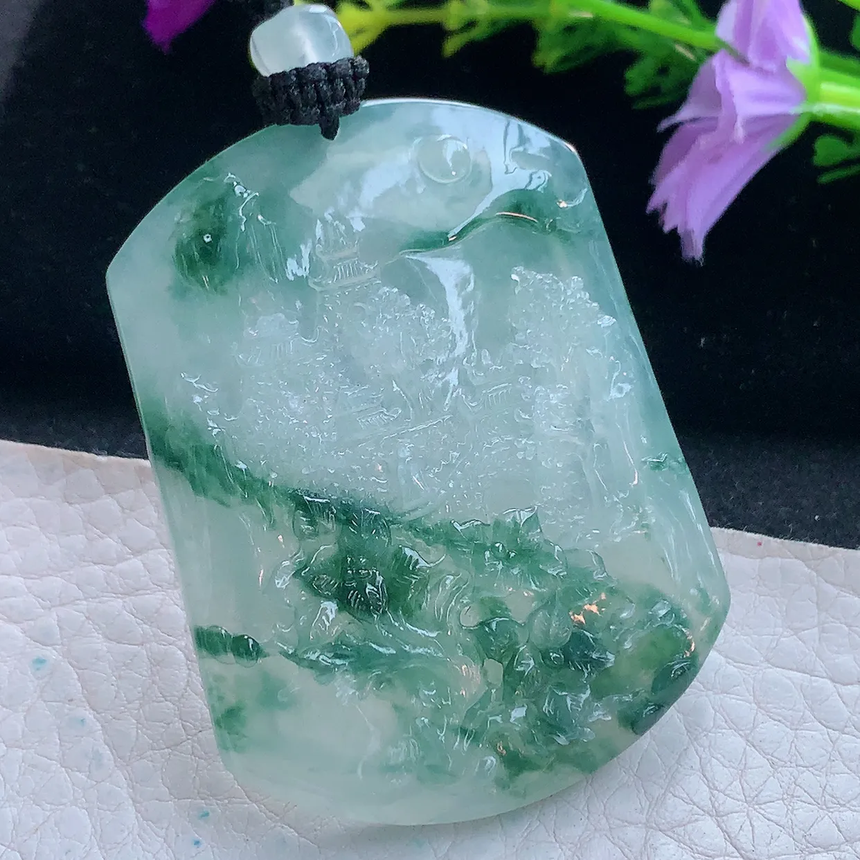 yl实拍55.3*42.2*5.8缅甸翡翠冰飘花山水牌吊坠,指日高升项坠