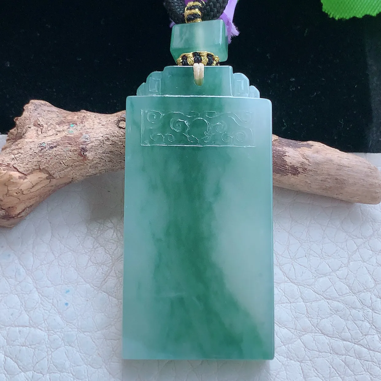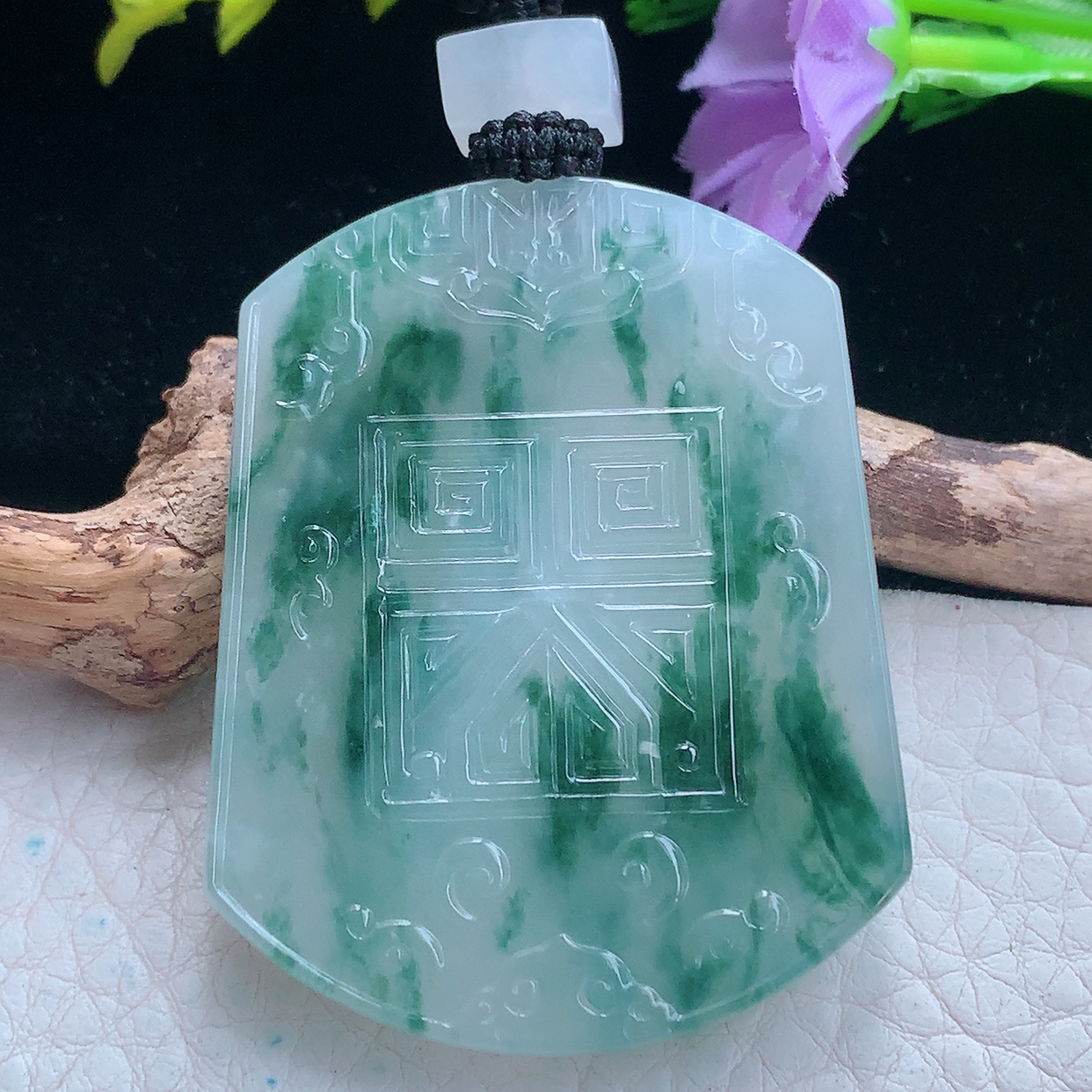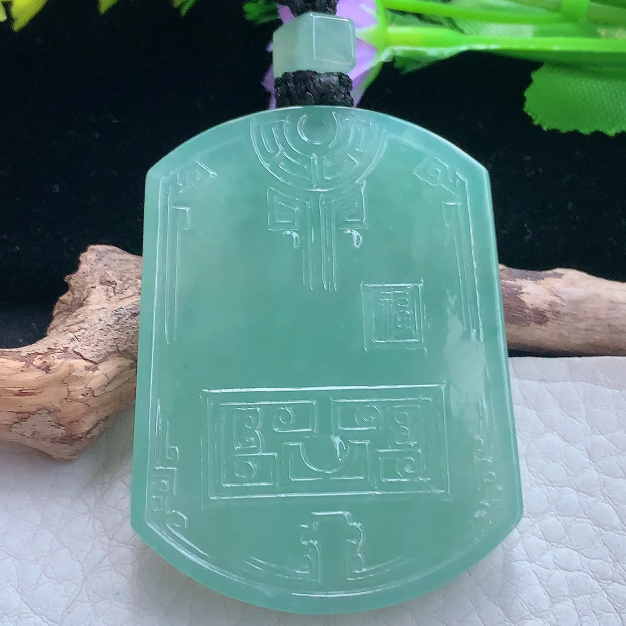 yl实拍52.8*40.2*5.6缅甸翡翠冰睛水仿古牌福临门吊坠,吉祥项坠雕花无事牌