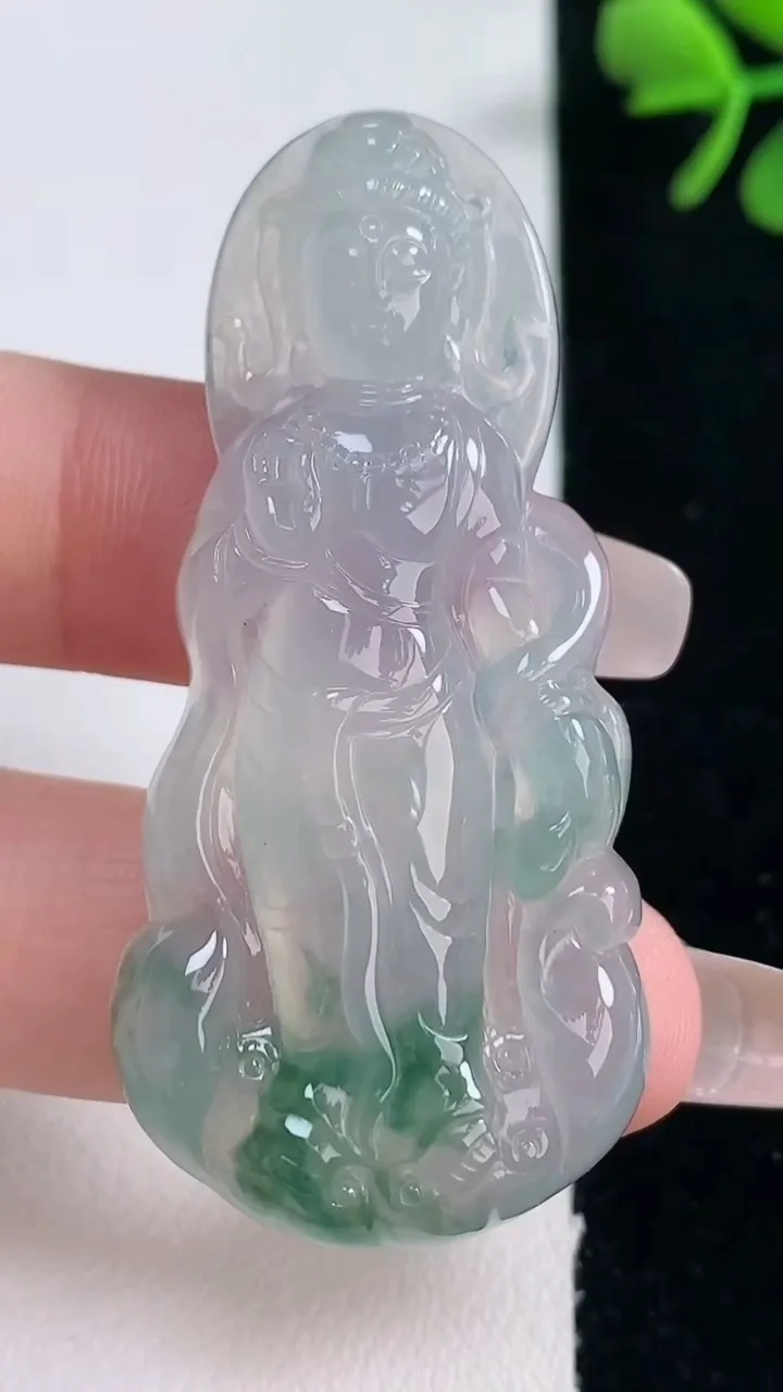 天然A货翡翠冰种飘花观音菩萨吊坠,尺寸53.7-23.7-6.5,重量:14.69g 2月5日