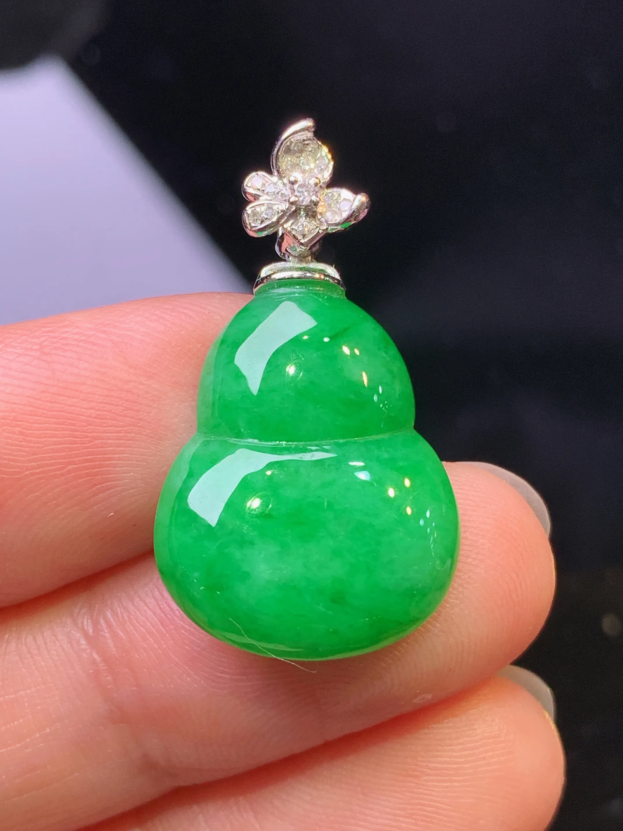 18k金钻镶嵌翠绿葫芦吊坠 玉质细腻 色泽艳丽清新 整体尺寸28*15.5*3.7