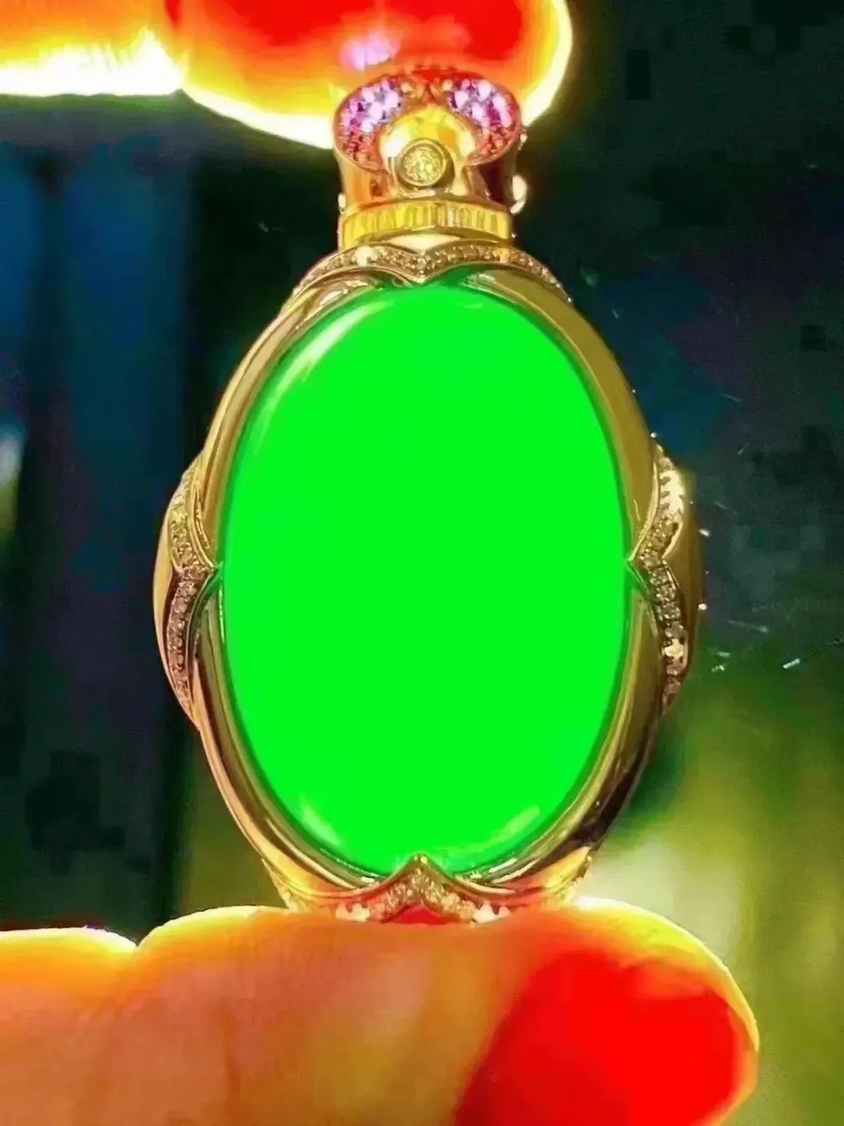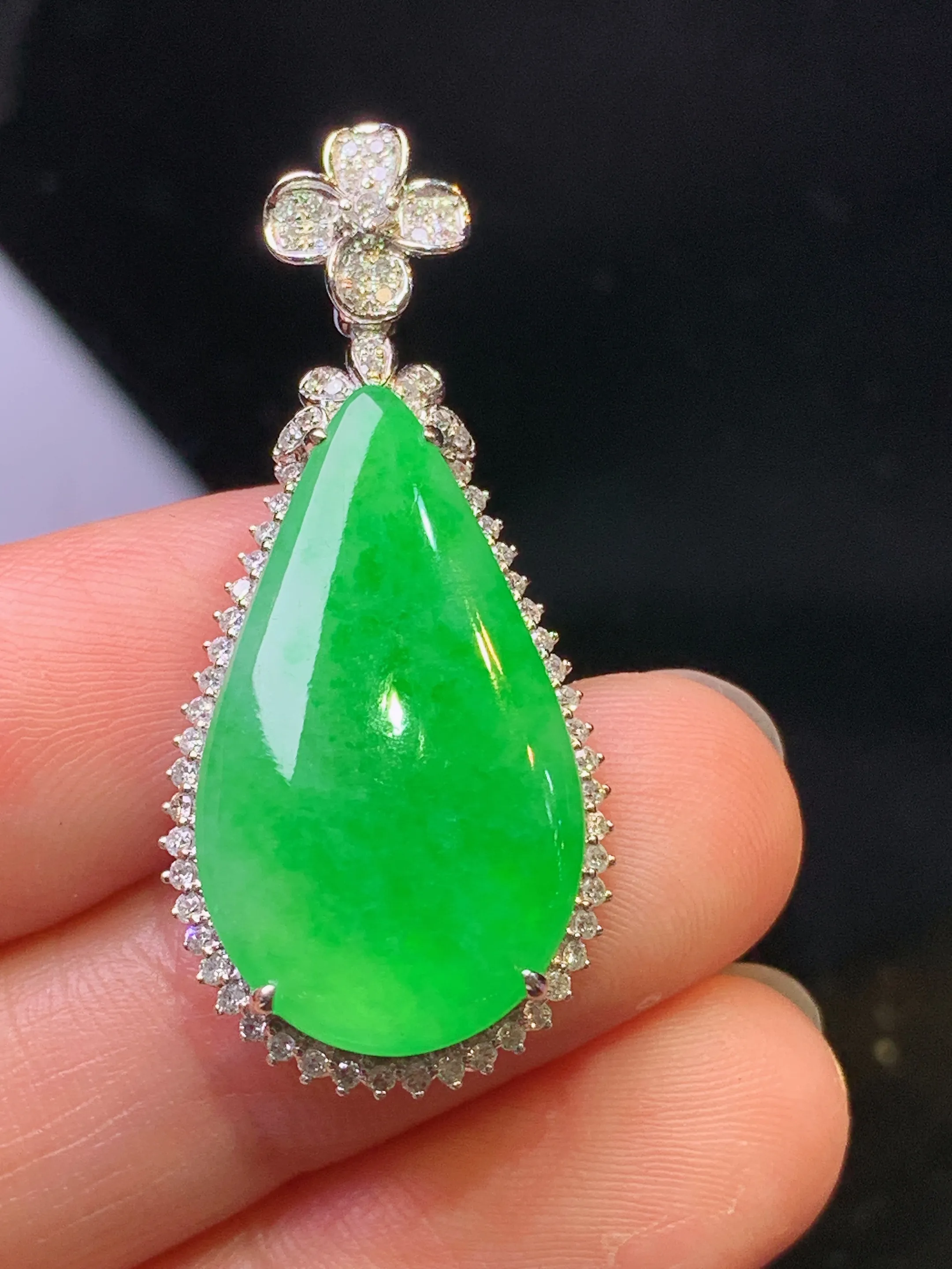 18k金钻镶嵌翠绿水滴吊坠 玉质细腻 色泽艳丽清新 整体尺寸37*16.6*6.2