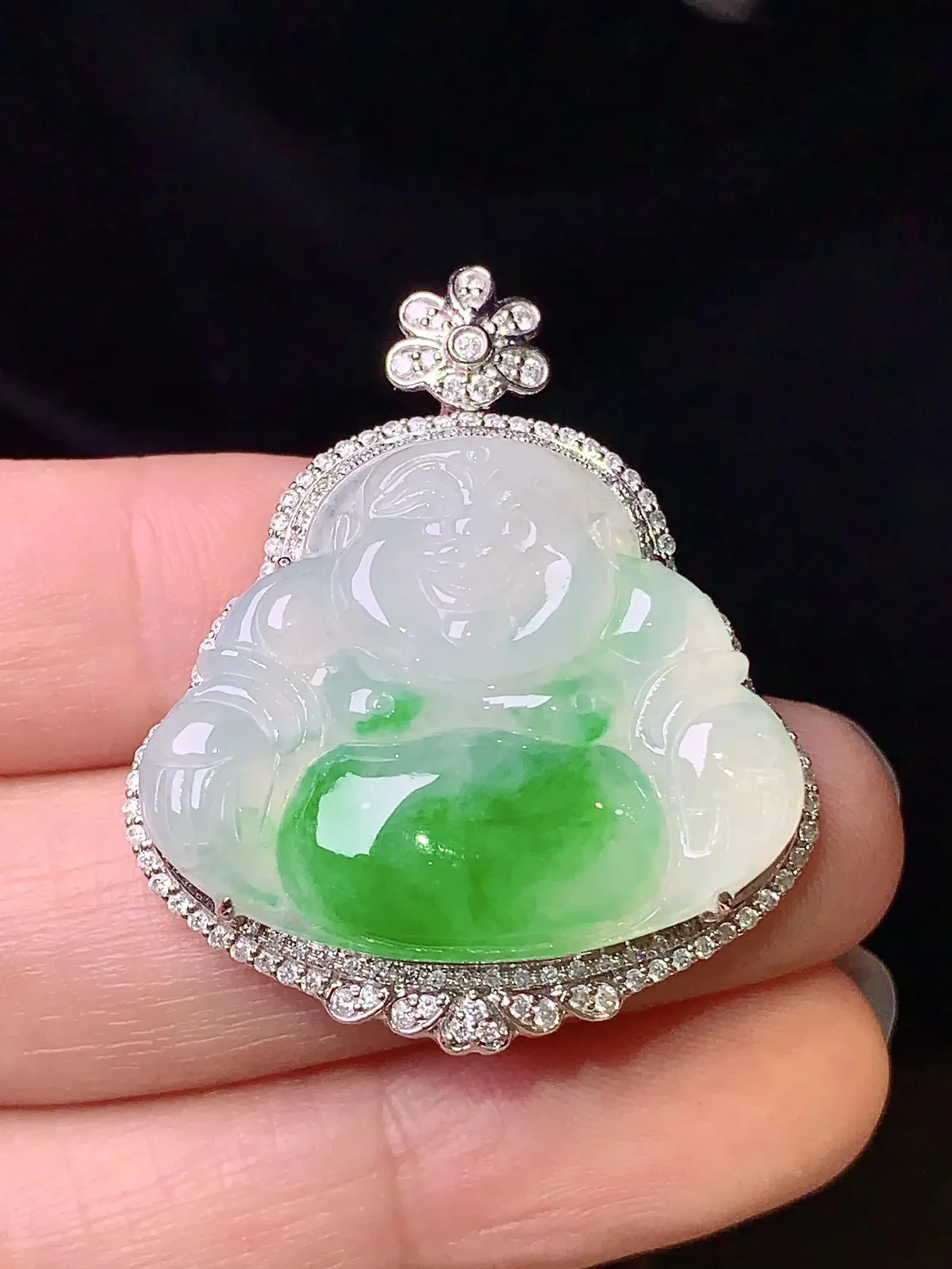 18k金钻镶嵌飘绿佛公吊坠 玉质细腻 色泽清新艳丽 整体尺寸35.2*30*9.6