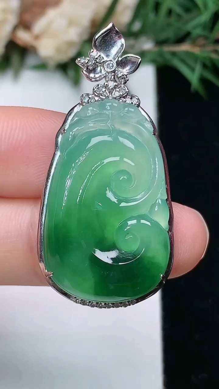天然A货翡翠如意吊坠,尺寸39.2-18.9-7.3,裸石27-17,重量:7.22g 4月4日