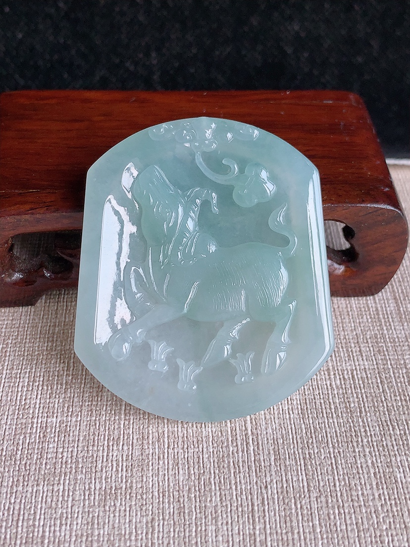 天然A货翡翠晴水生肖牛吊坠 尺寸53.2-45.3-5.6mm 重量29.16g 0409