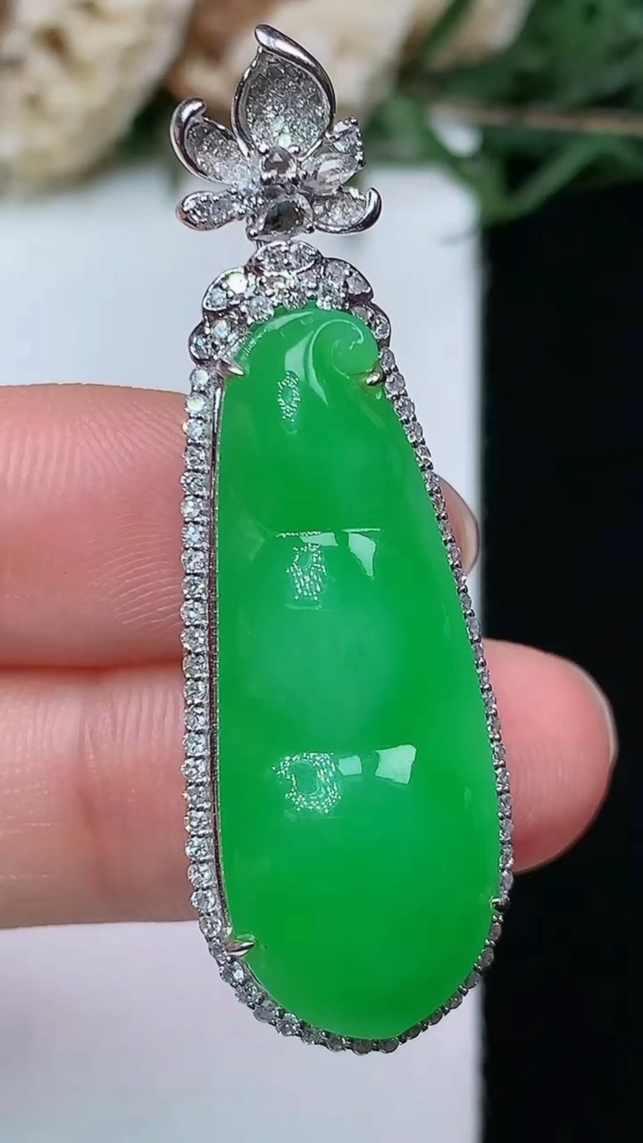 阳绿福豆吊坠,18k金镶嵌,冰润色阳,玉质细腻,种水足,Fj 尺寸33.1*12.2*7.8