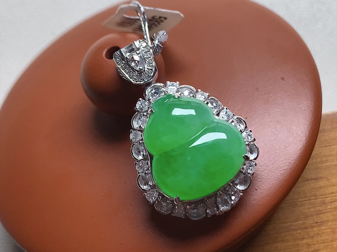 18k金钻镶嵌冰种葫芦吊坠 玉质细腻 色泽艳丽清新 水润亮眼 整体尺寸25.8*14*7yz
