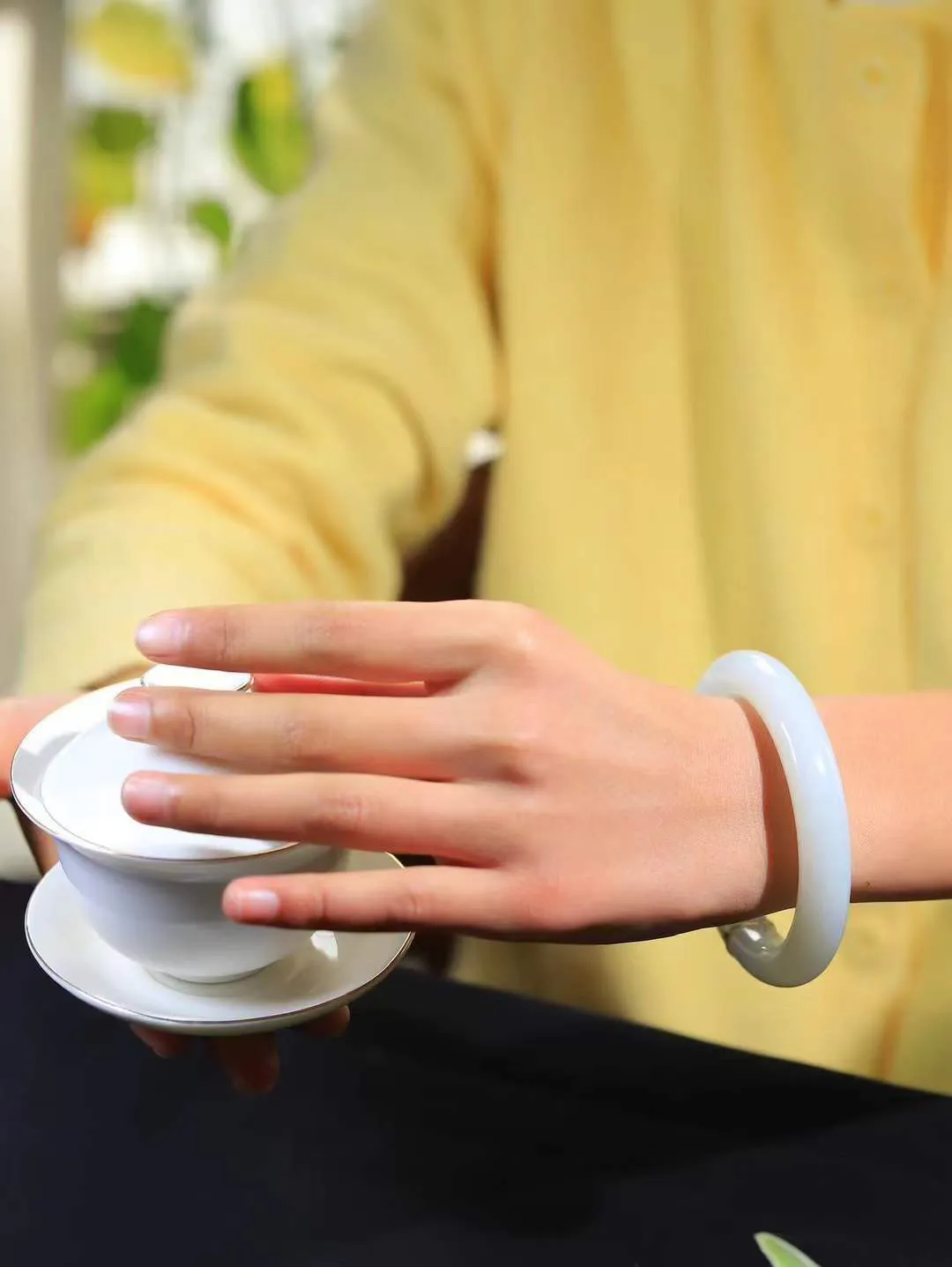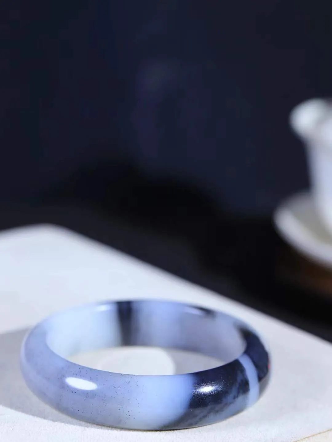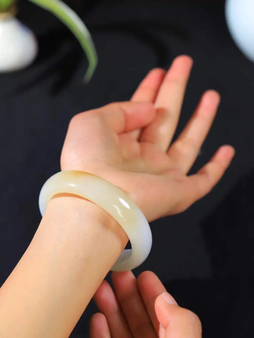 和田玉51.5圈晴水色宽条手镯!清水色!玉质细腻油润 底色纯净 无裂无杂 脂粉好,品质高。