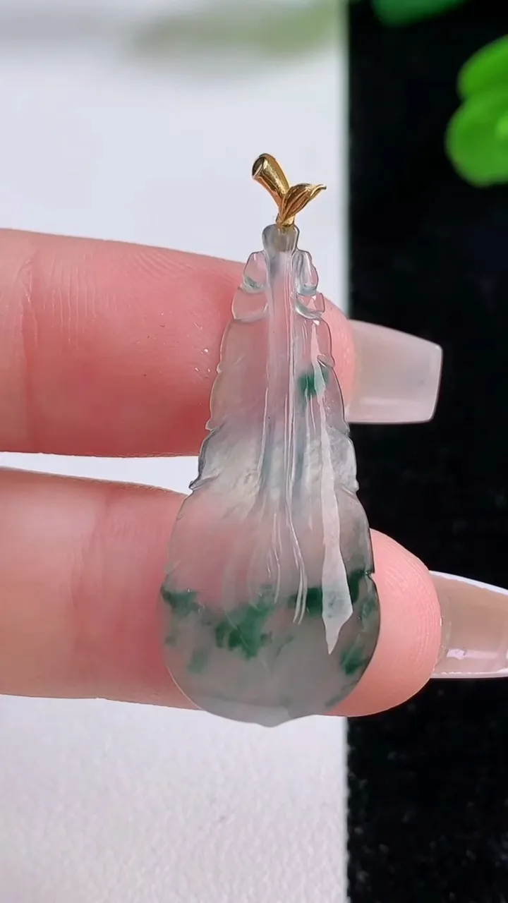 自然光实拍,18K金镶嵌水润飘绿翡翠平安无事牌吊坠,平平安安,无事牌翠色灵动,佩戴平安时尚!#83.