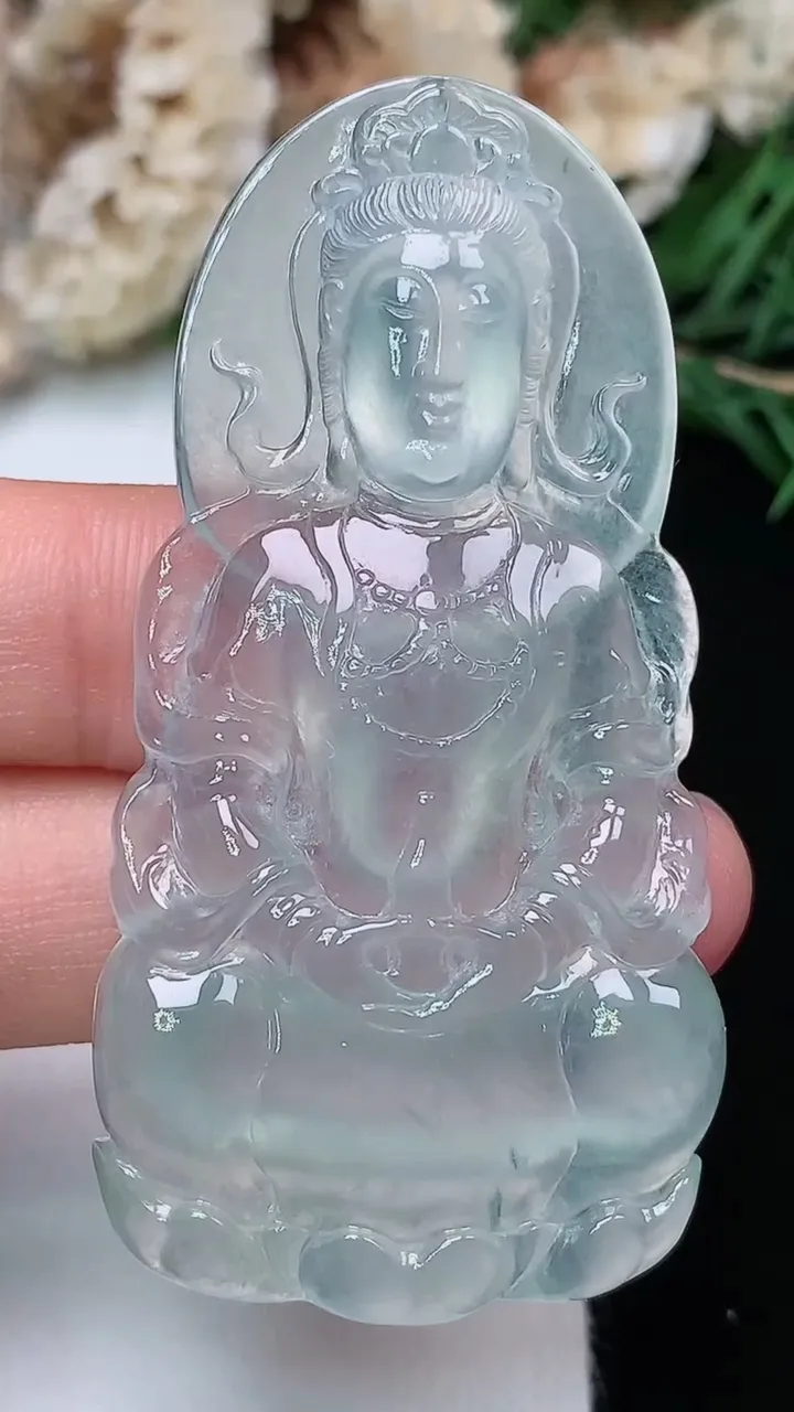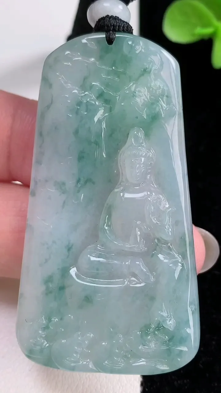 天然A货翡翠冰种飘花山水观音菩萨吊坠,尺寸58.6-32.7-5.2,重量:28.30g 12月14