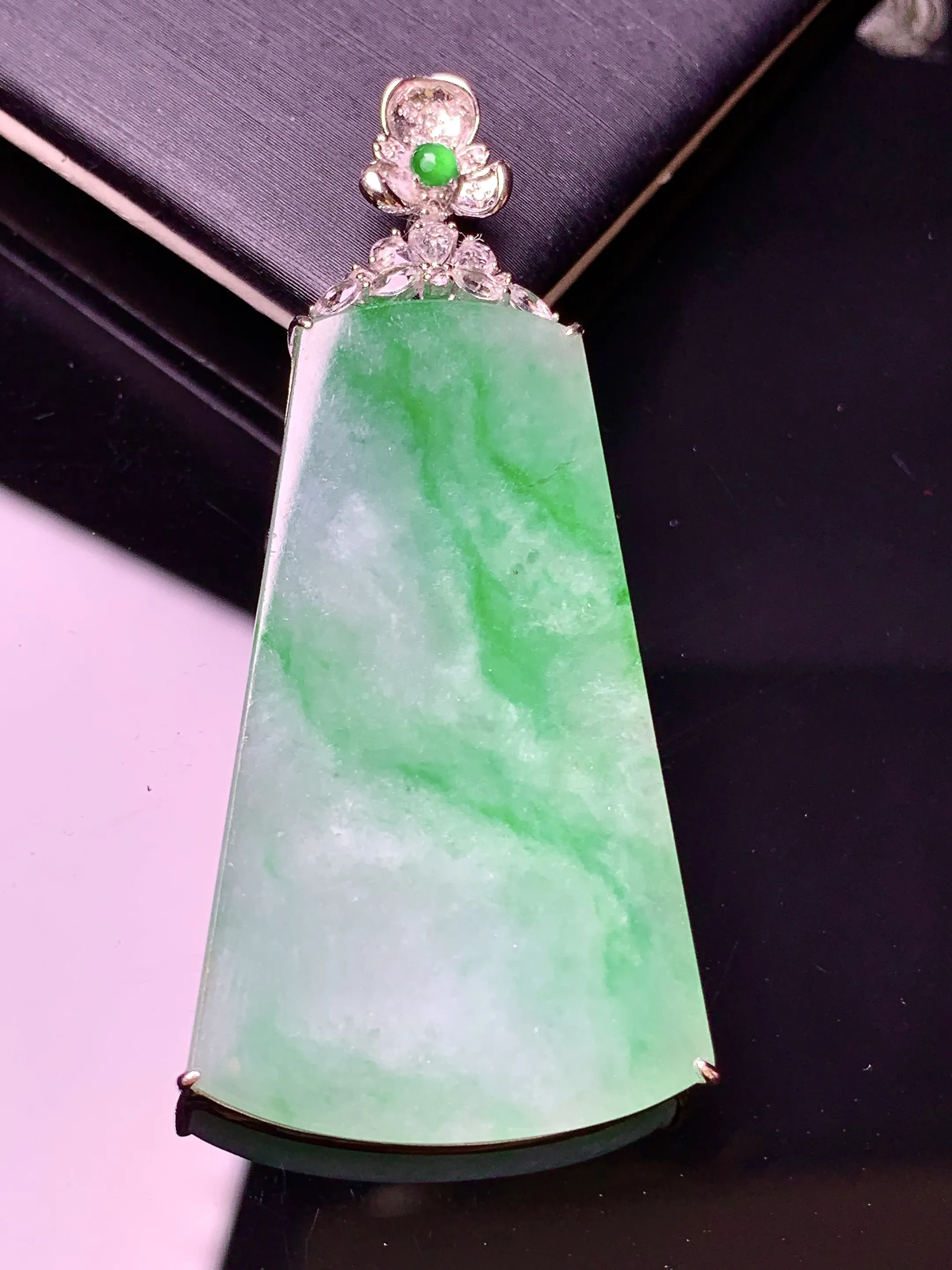 18k金钻镶嵌飘绿无事牌吊坠 玉质细腻 色泽清新艳丽 整体尺寸54.2*25*4.3
