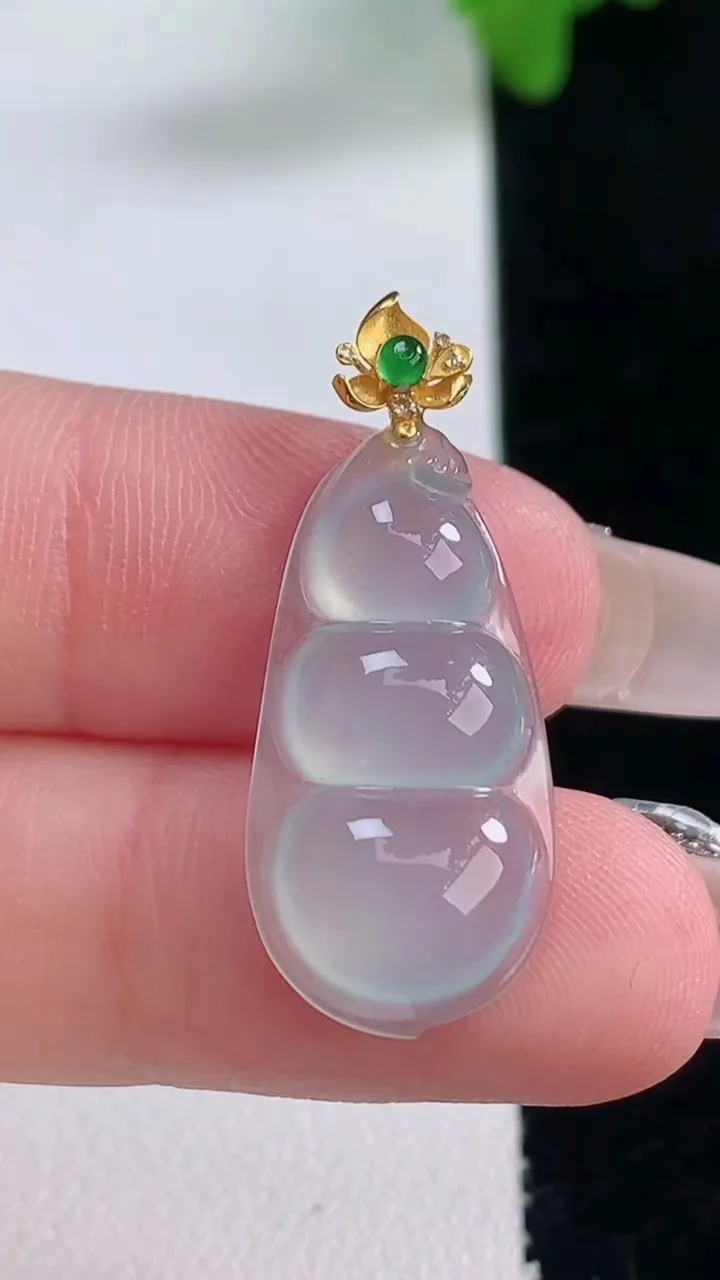 18K金镶嵌冰种飘花翡翠招财福瓜吊坠,精美饱满福瓜,种水足,形态圆润饱满,福相十足 !#1.30