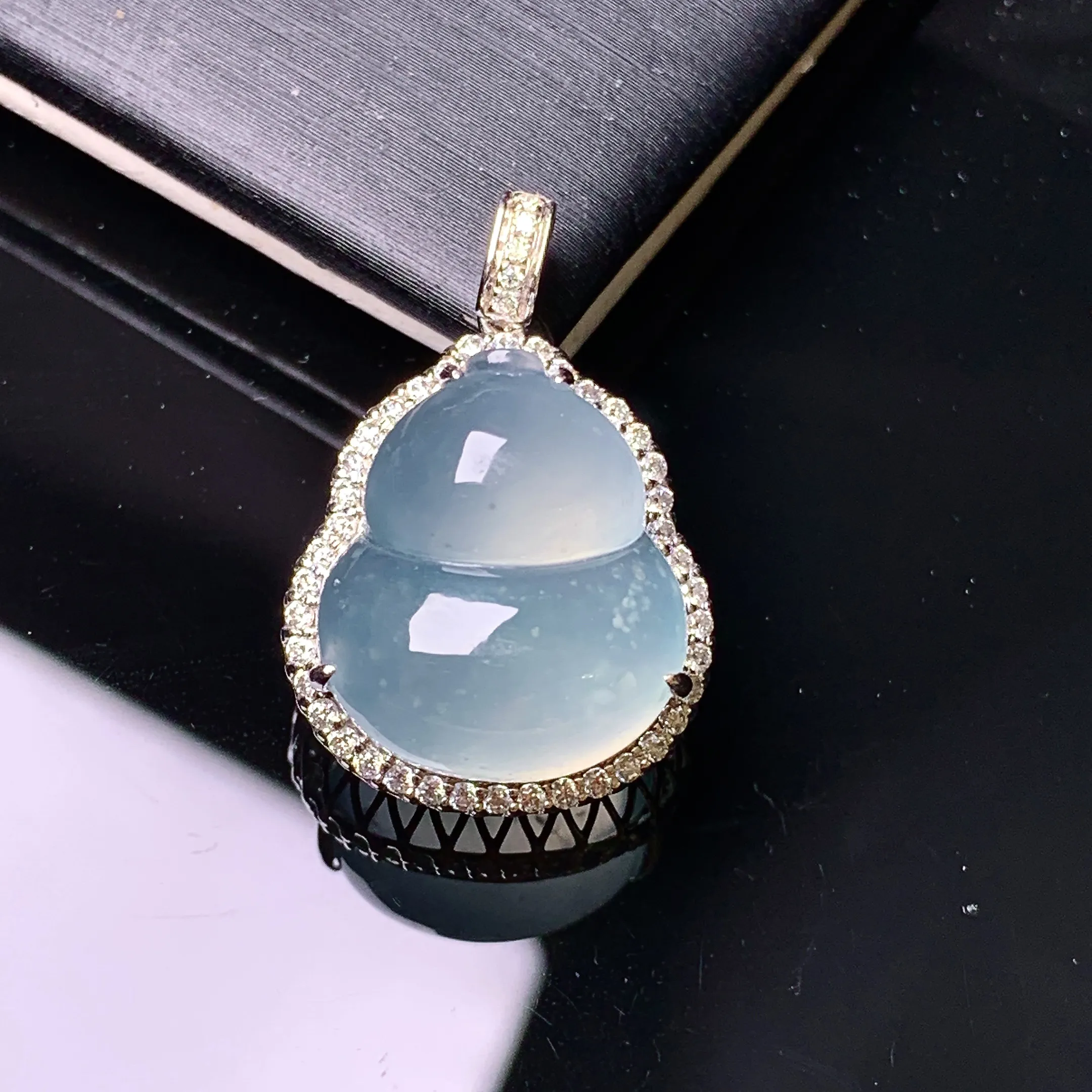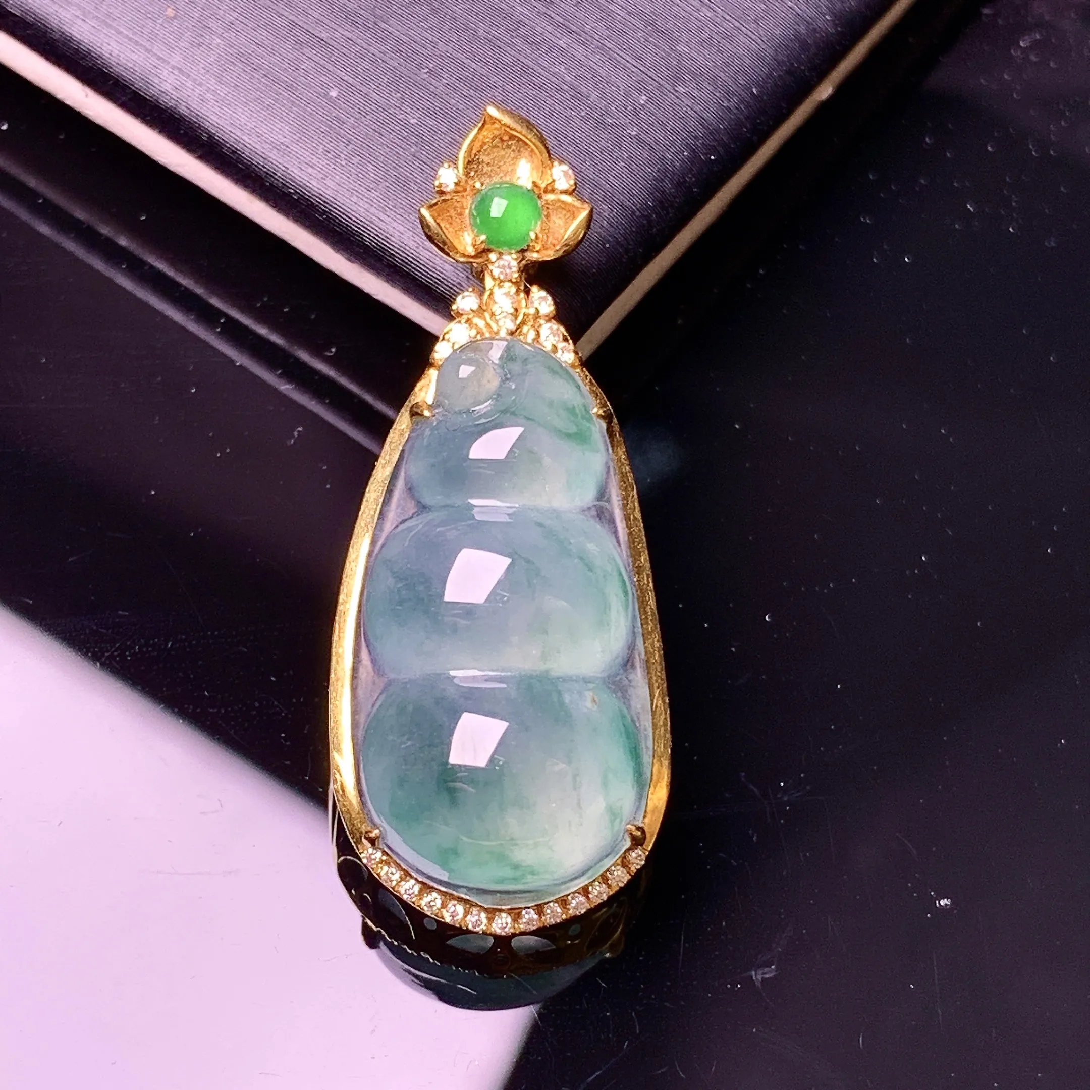 阳绿蛋面吊坠,色泽均匀艳丽,玉质细腻,荧光感超 强,饱满圆润,尽显优雅气质,18k 金豪华镶嵌