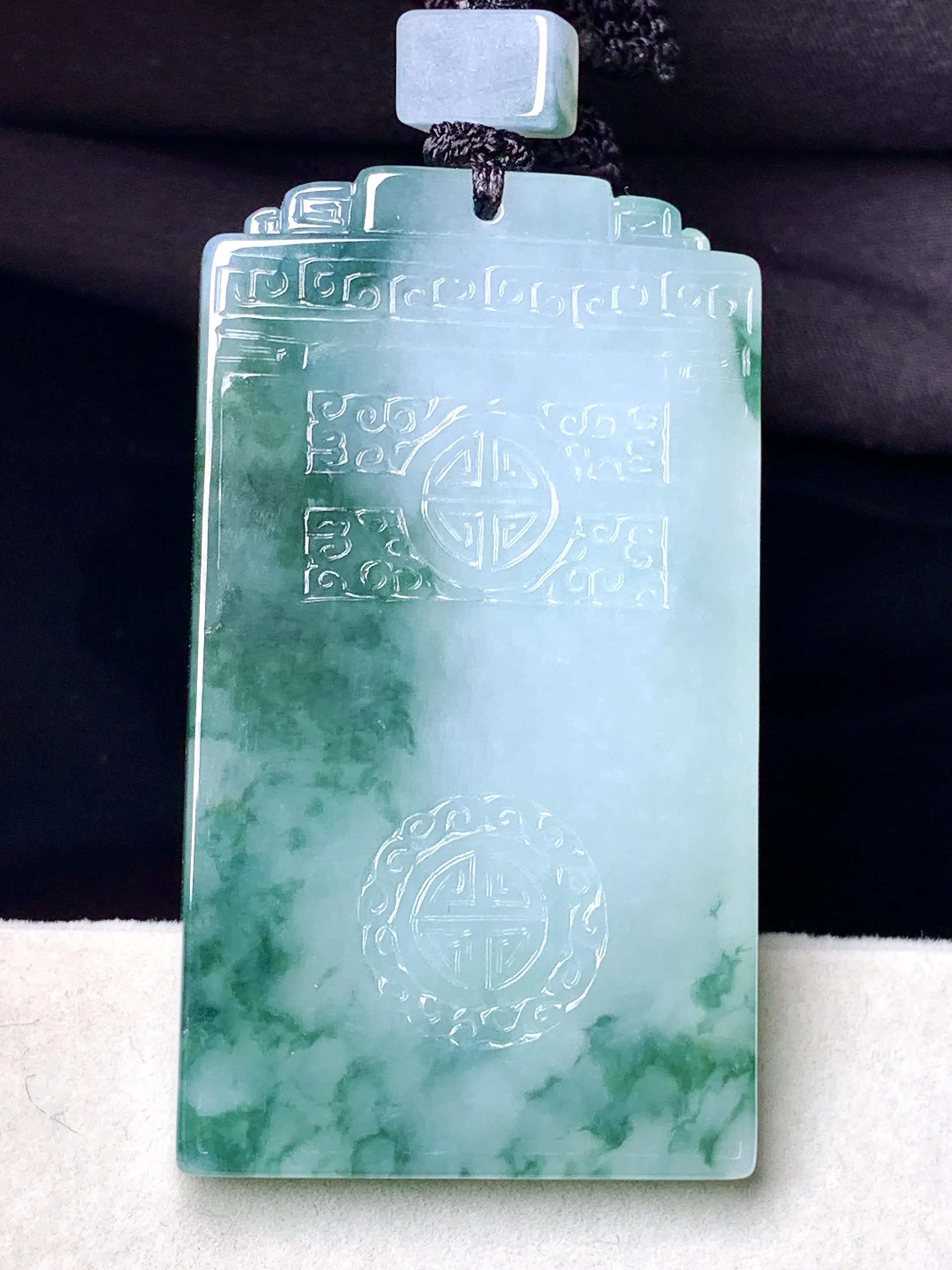 飘绿雕花无事牌吊坠 玉质细腻 色泽清新艳丽 整体尺寸54*30.8*5.8