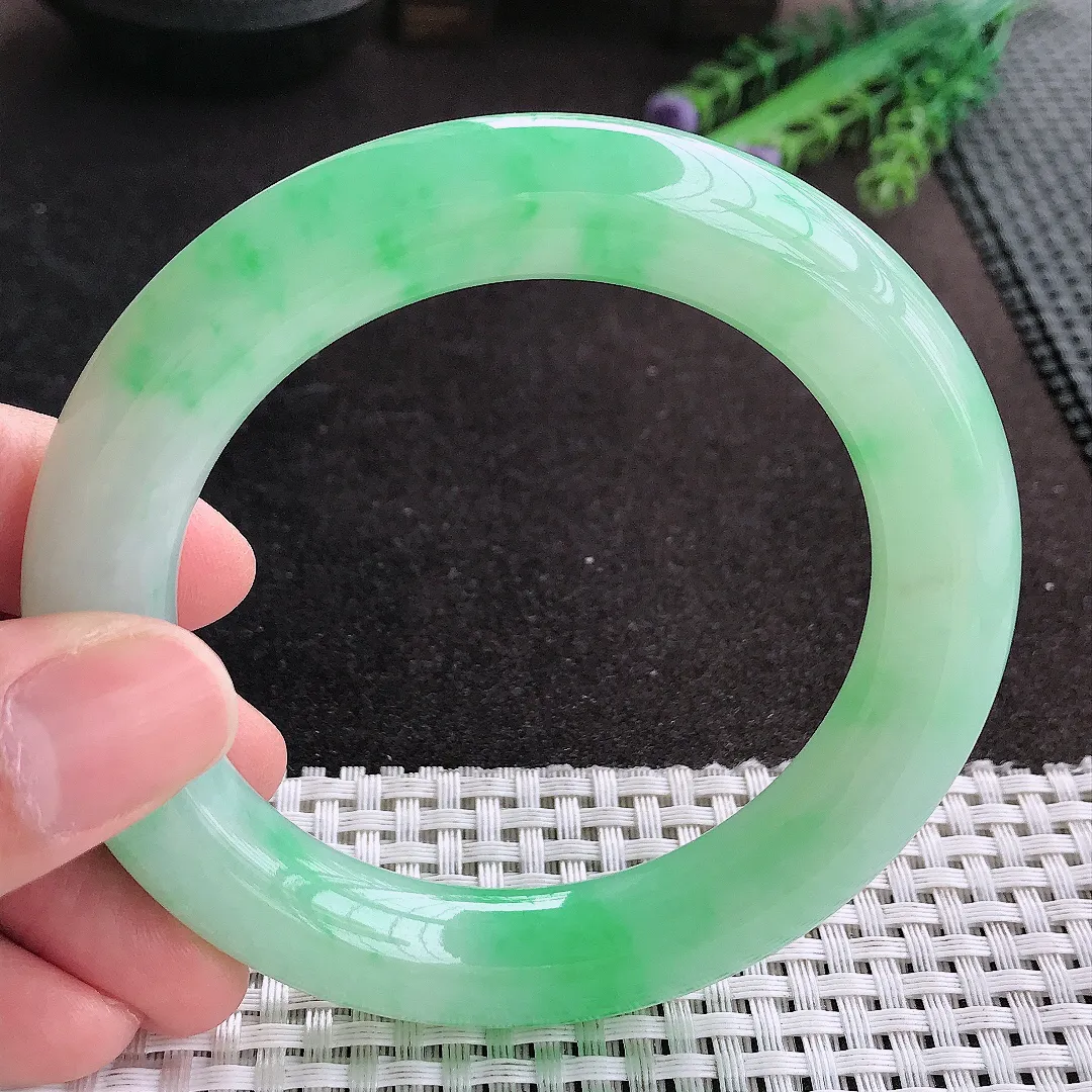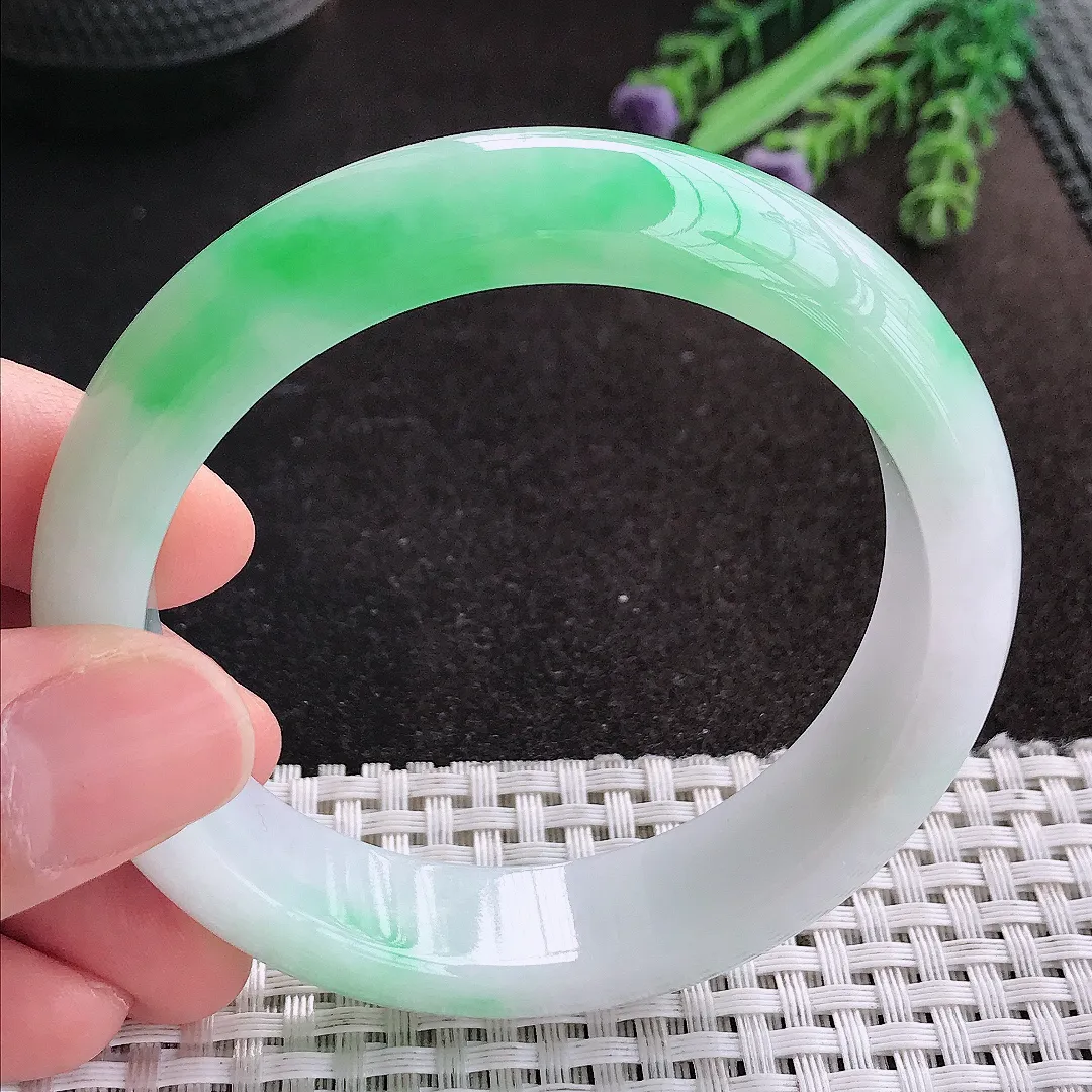 天然A货翡翠57/14.2/8.5老坑冰润起胶白底青飘阳绿手镯宽边玉手镯
