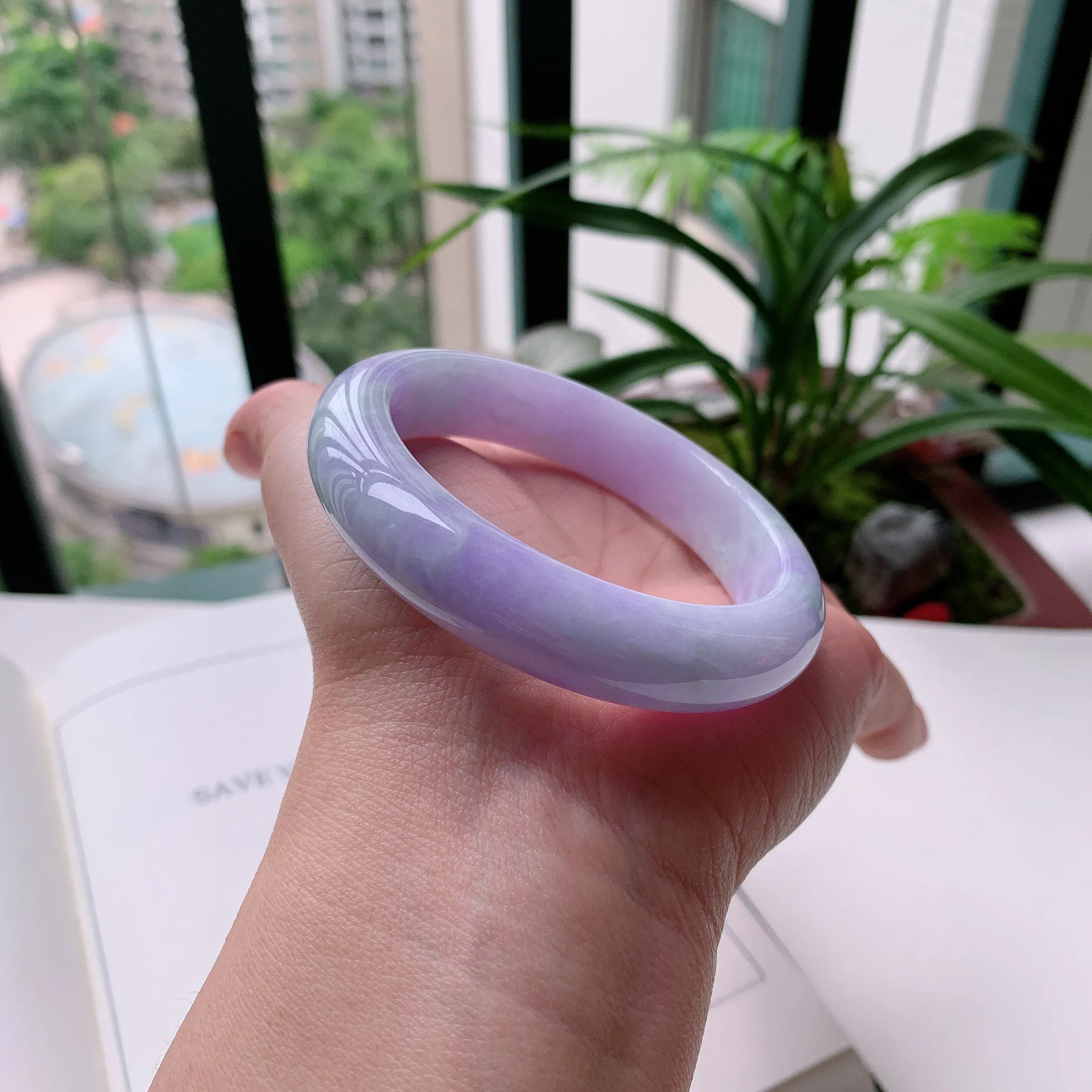 55.5圈有种有色天然翡翠A货淡紫玉手镯好种水春彩水润手镯46.01g