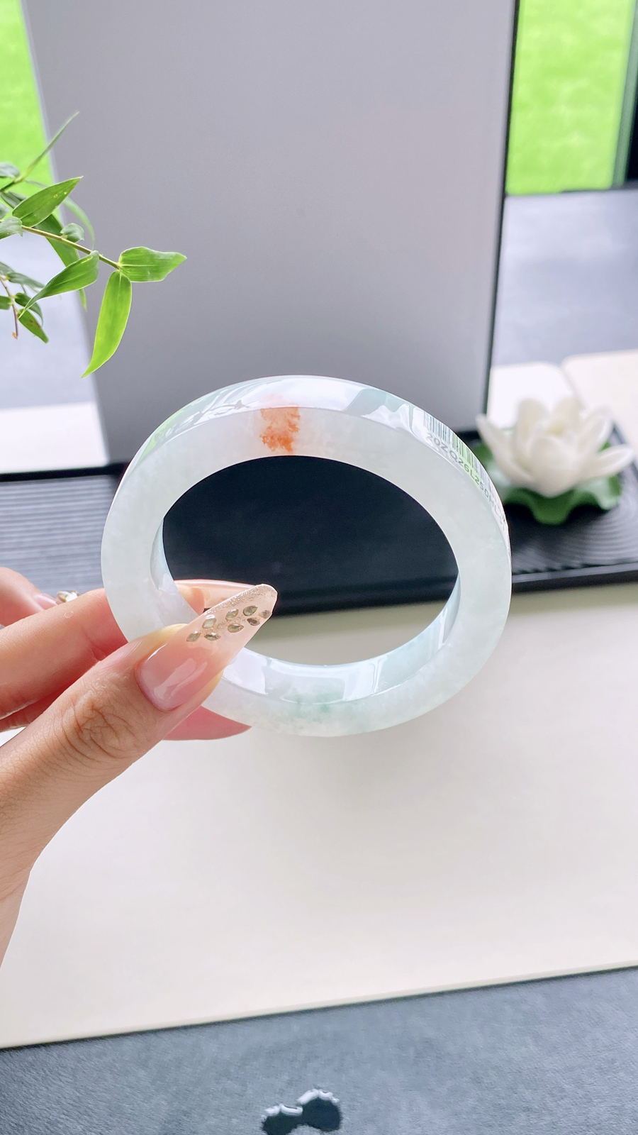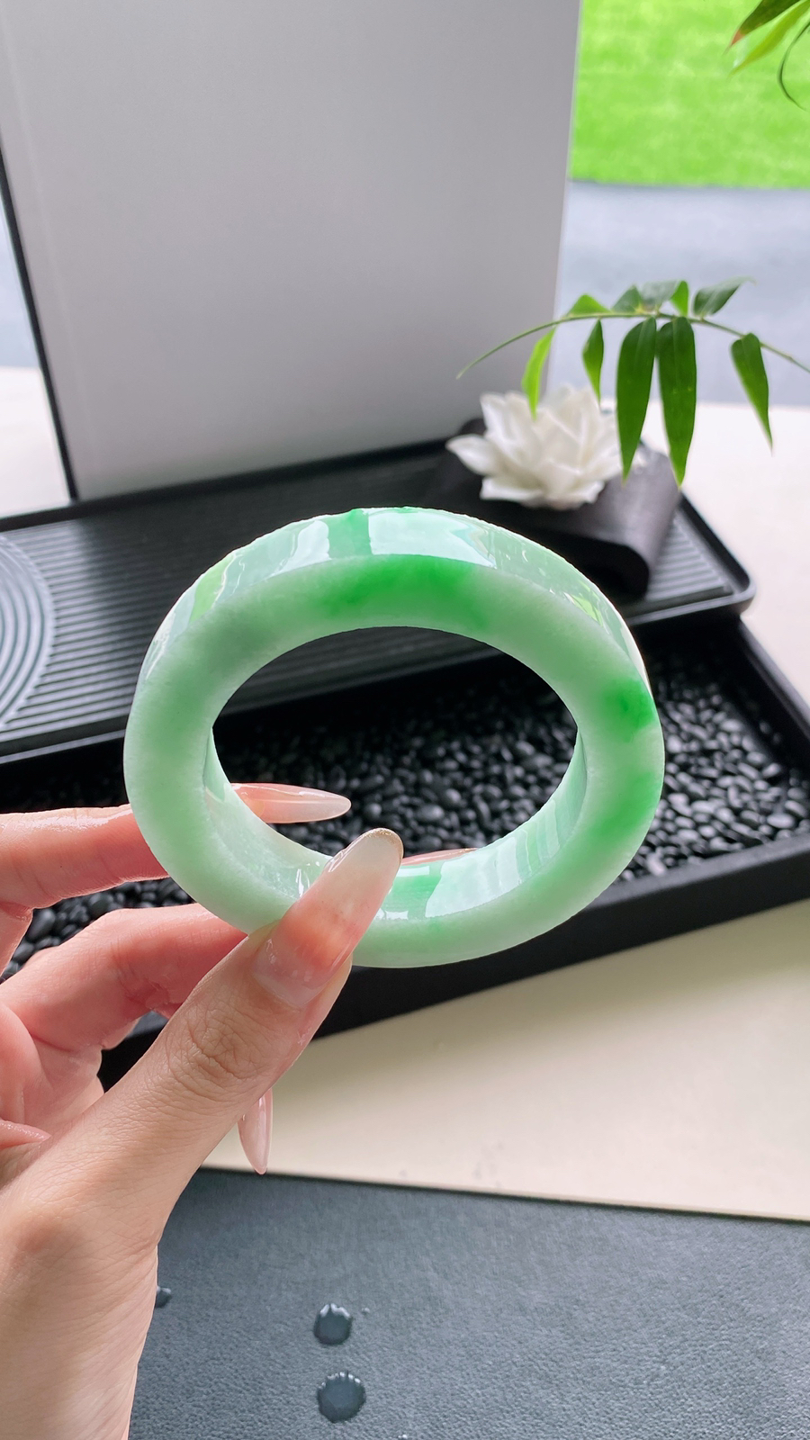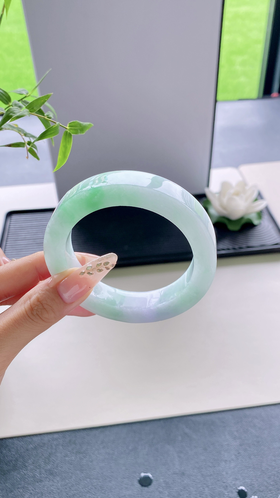 【牛奶底飘花手镯】如清泉般泌人心脾丝丝绿花润进心田,如清风徐来,令人心旷神怡,有种独一无二的诗意美