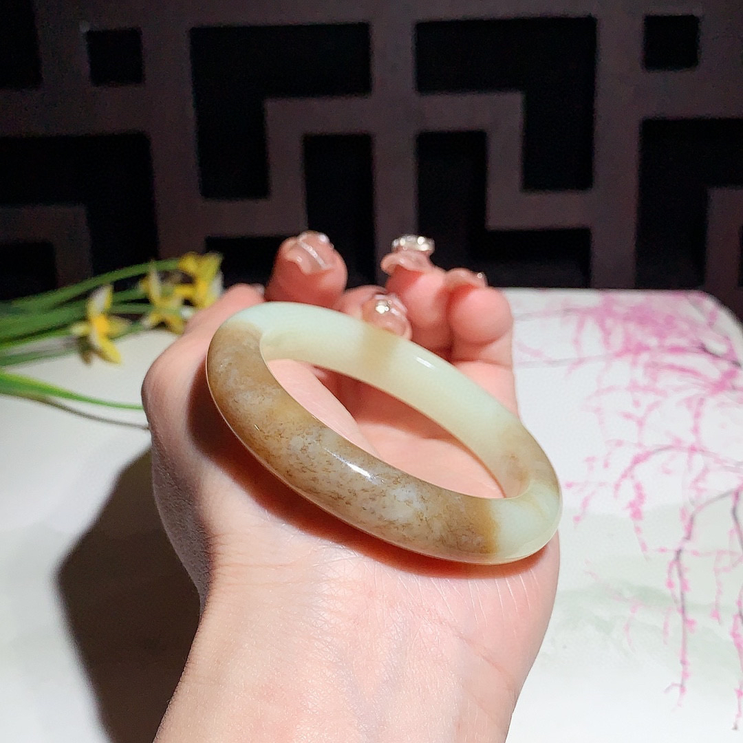 和田玉55圈且末糖手镯!玉质细腻油润 底色纯净 无裂无杂黑 脂粉好,品质高。