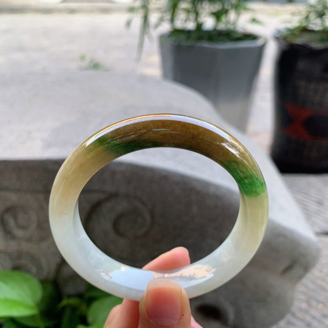 A货天然翡翠冰糯种黄飘花手镯59圈重量50.66 4月24日