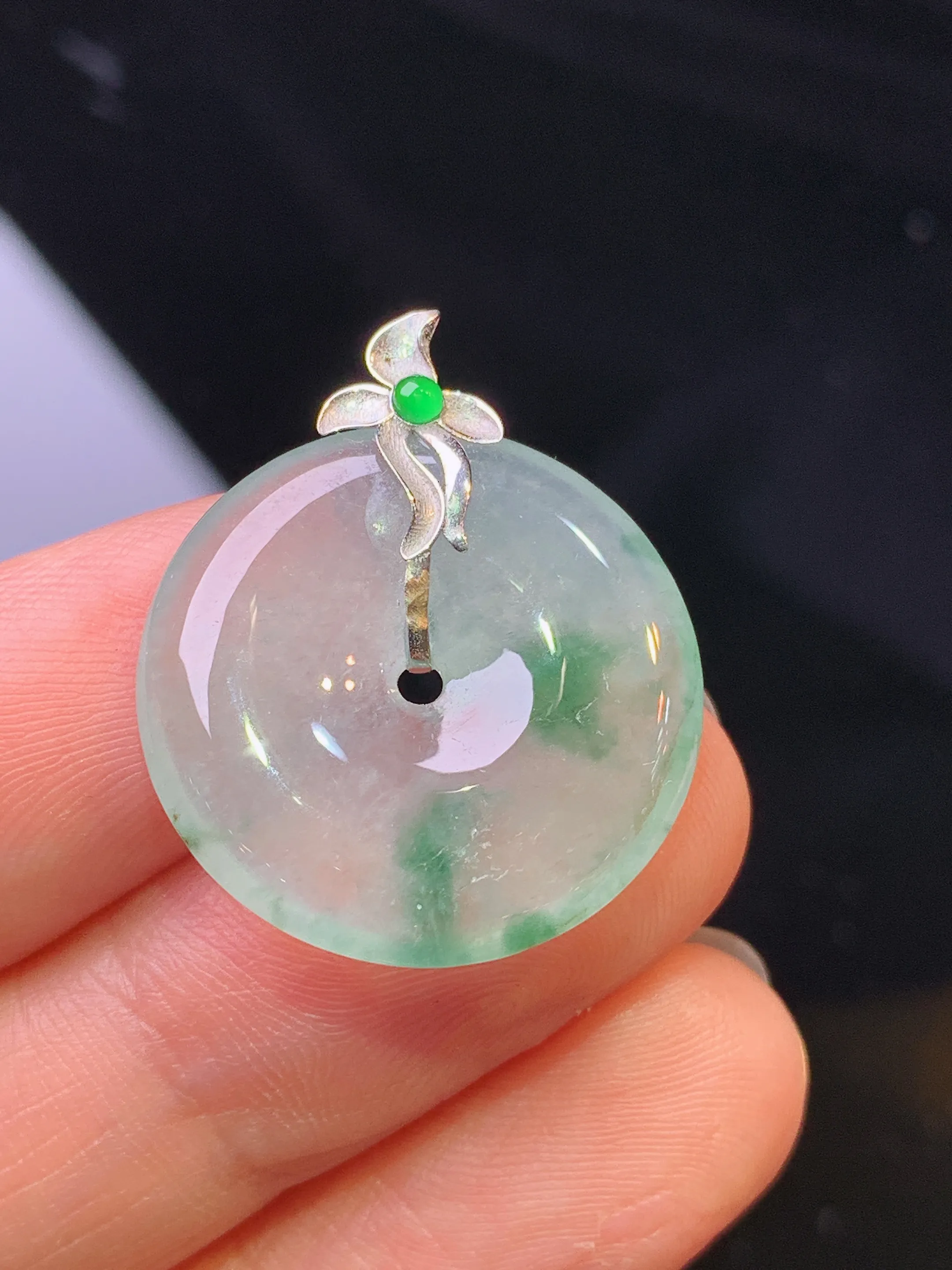 18k金镶嵌冰种平安扣吊坠 玉质细腻 色泽清新艳丽 整体尺寸25.3*21.1*4.2