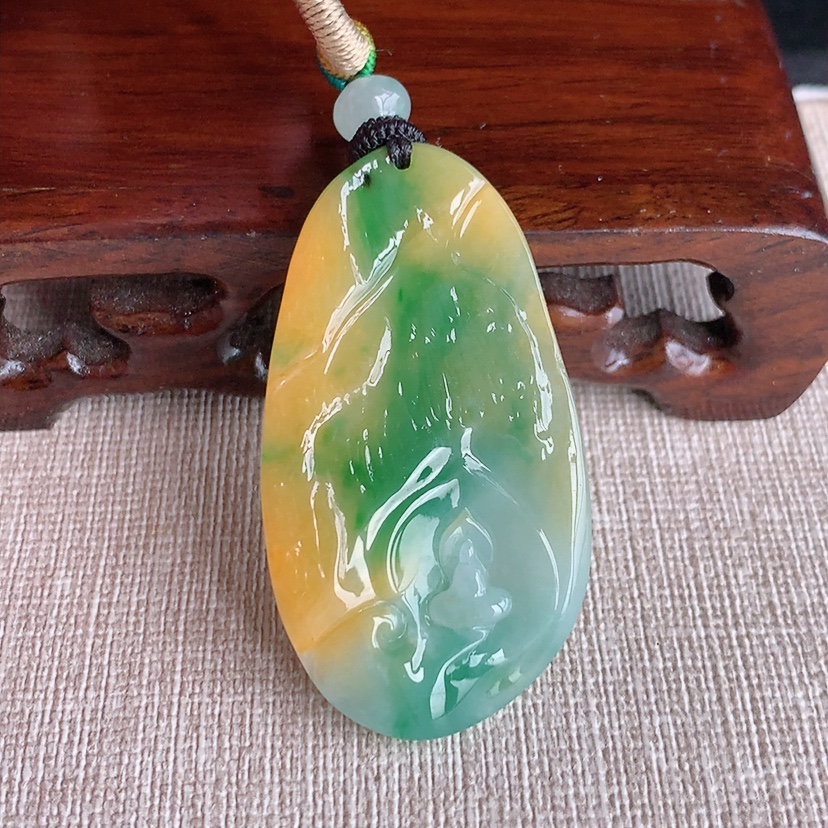 天然A货翡翠黄加绿双彩悟道吊坠 尺寸47-26.2-5.3mm 重量17.00g 0322