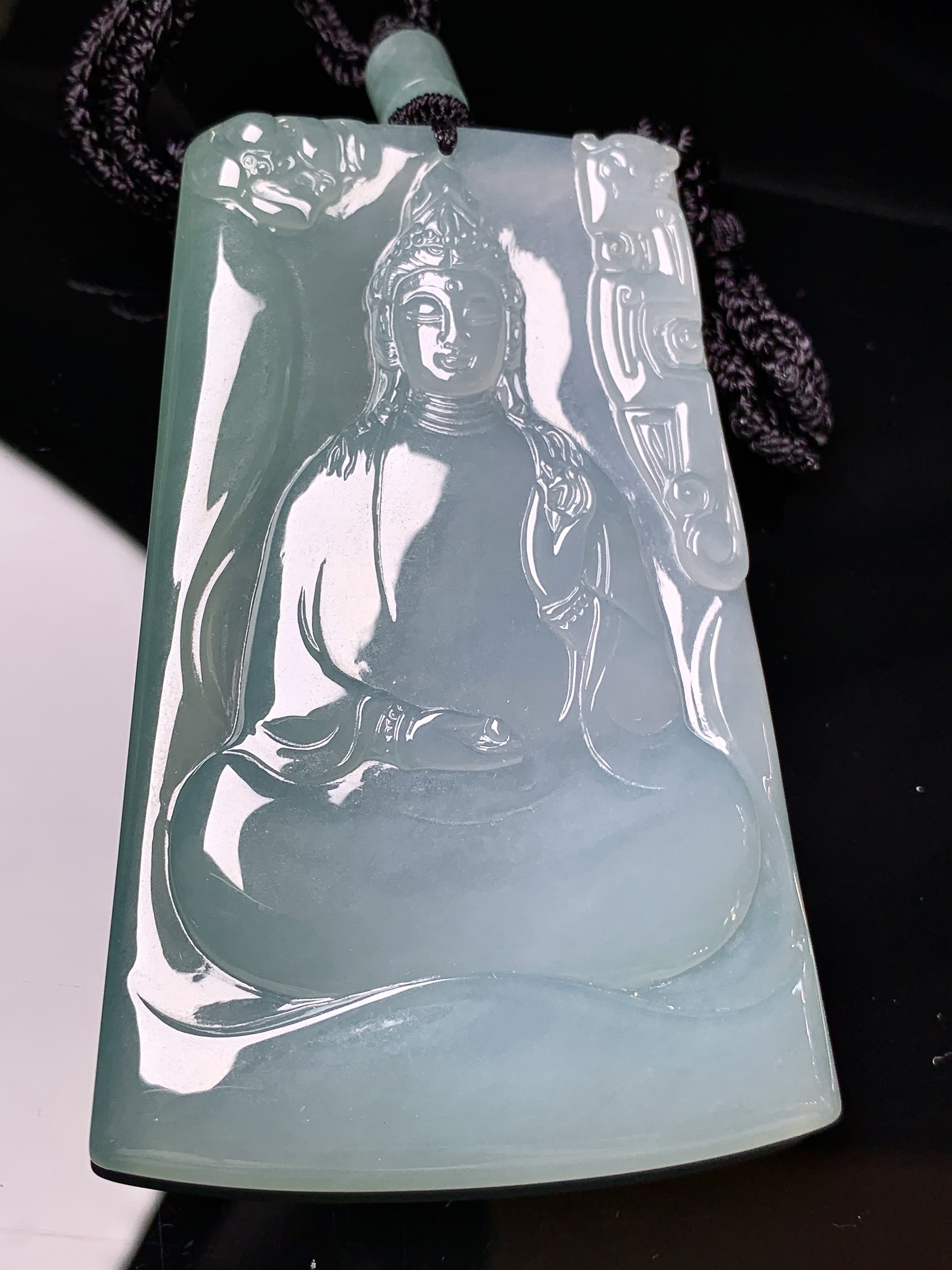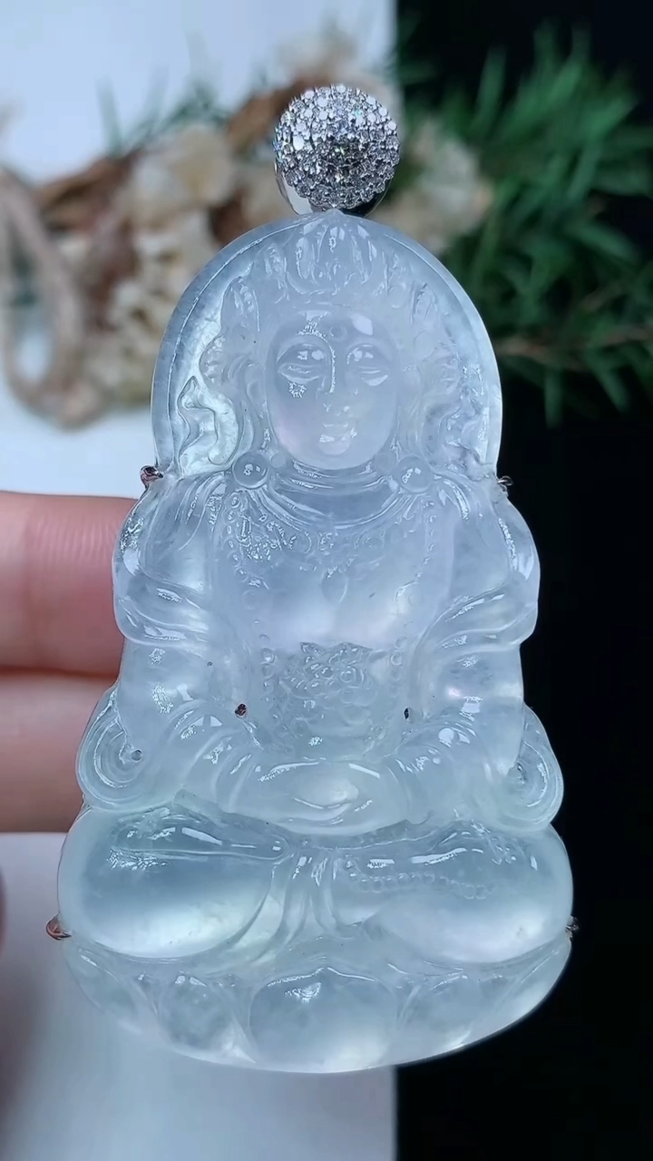冰种观音菩萨吊坠 玉质细腻 色泽艳丽清新 水润亮眼 整体尺寸71.5*47.2*5.6L1
