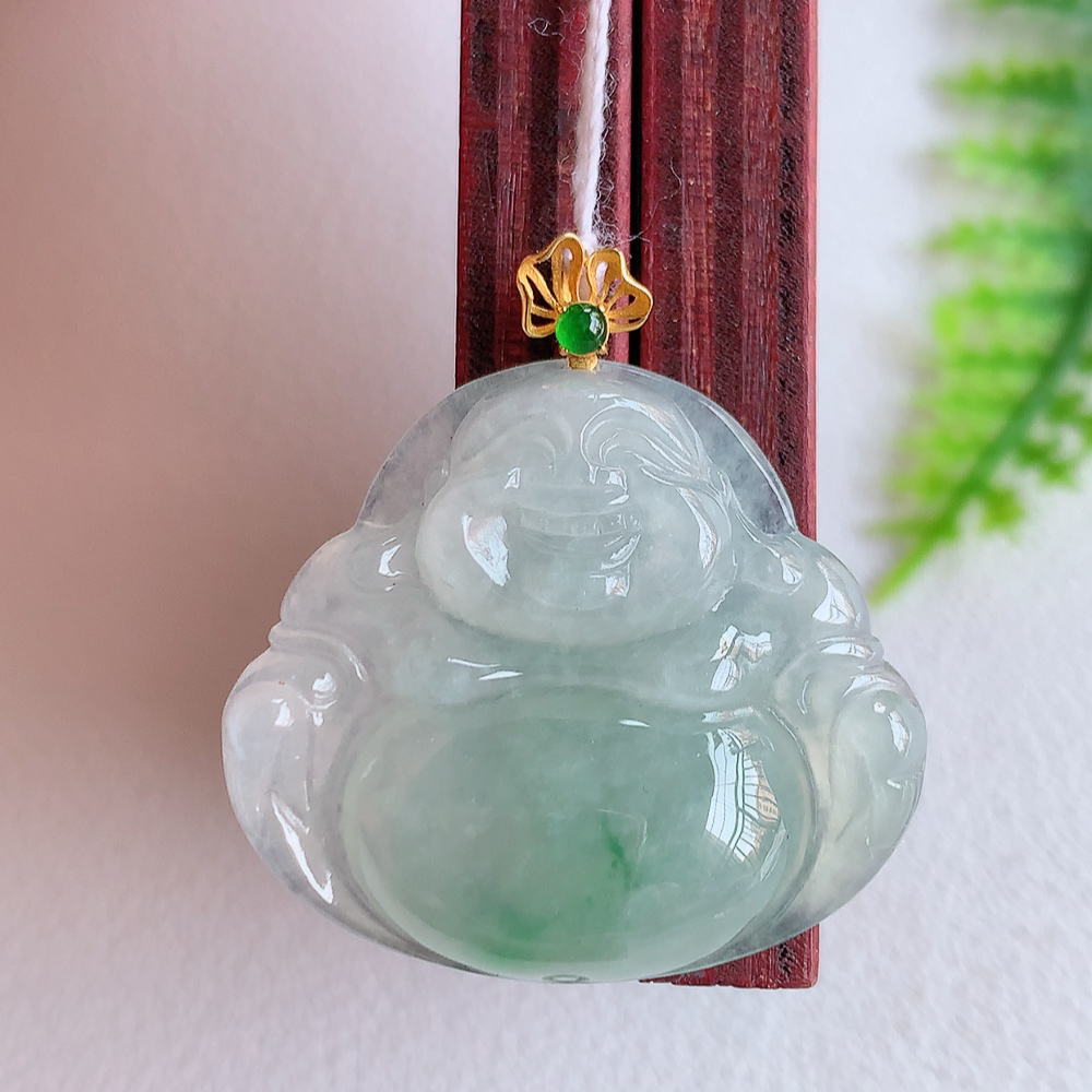 18k金扣冰润飘花佛公挂件 玉质细腻 精雕弥勒佛,笑佛福耳垂肩,面相喜庆,开怀大笑,憨态可掬。惟妙