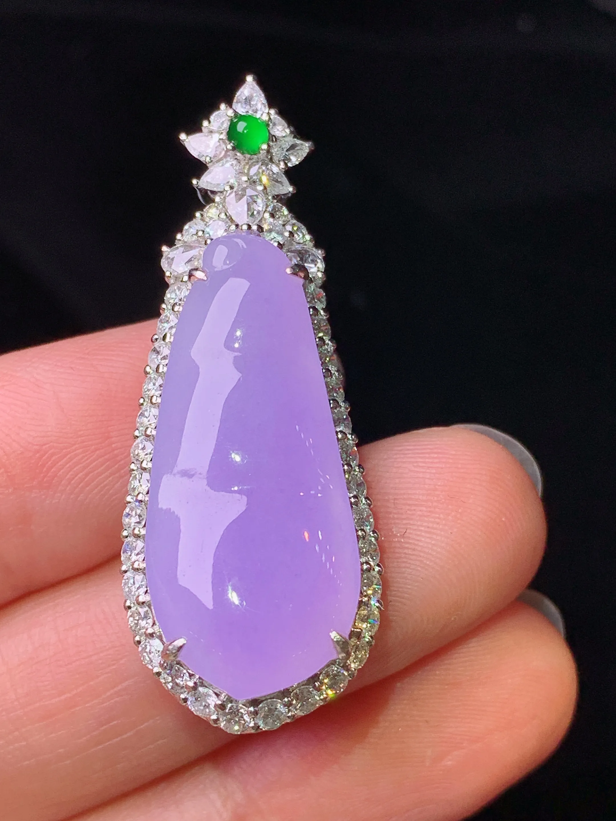 18k金钻镶嵌紫罗兰四季豆吊坠 玉质细腻 色泽艳丽清新 整体尺寸40.7*15.3*10