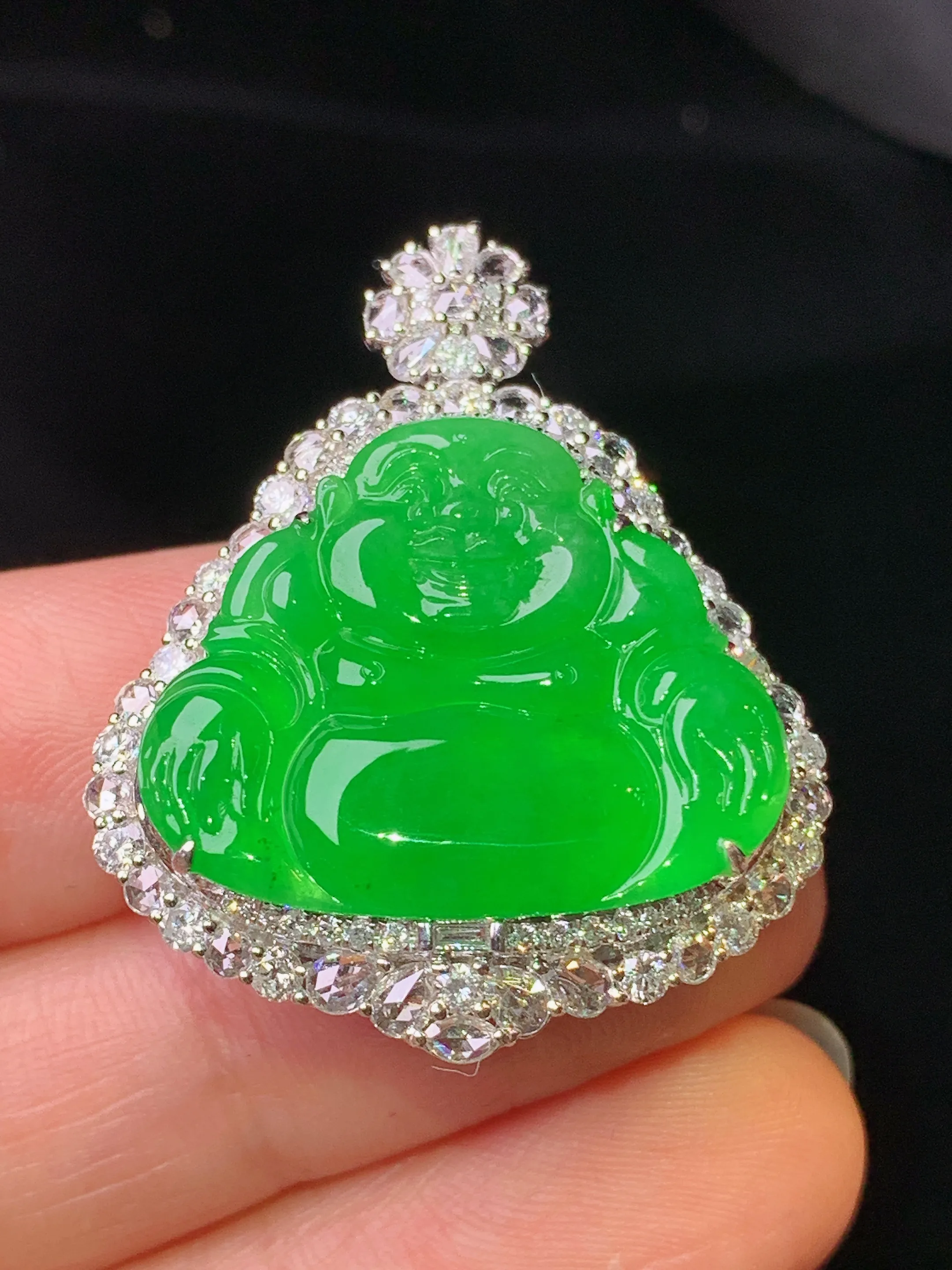 18k金钻镶嵌满绿佛公吊坠 玉质细腻 色泽艳丽清新 整体尺寸33.6*27.5*10