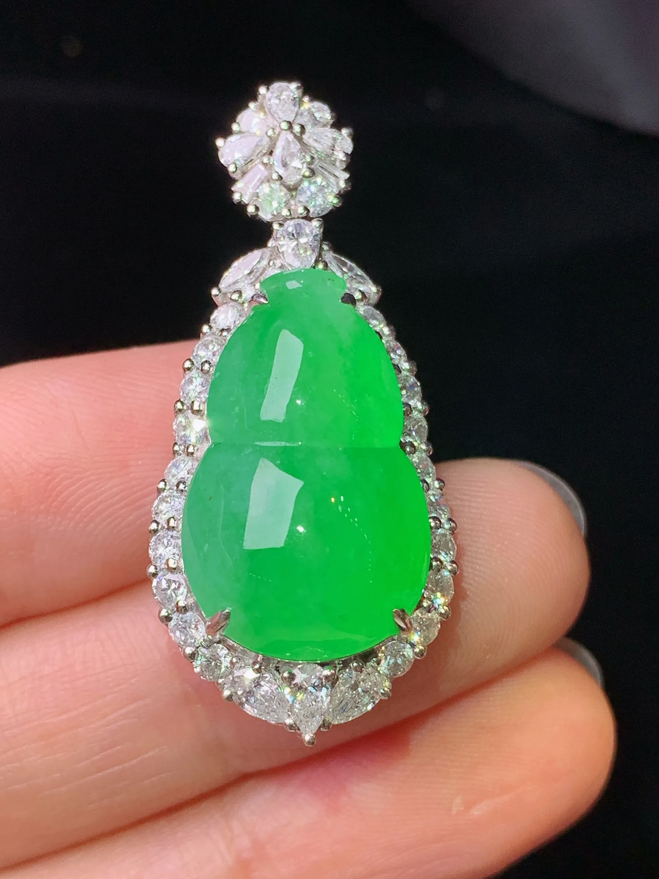 18k金钻镶嵌翠绿葫芦吊坠 玉质细腻 色泽艳丽清新 整体尺寸37.7*16.8*14.5