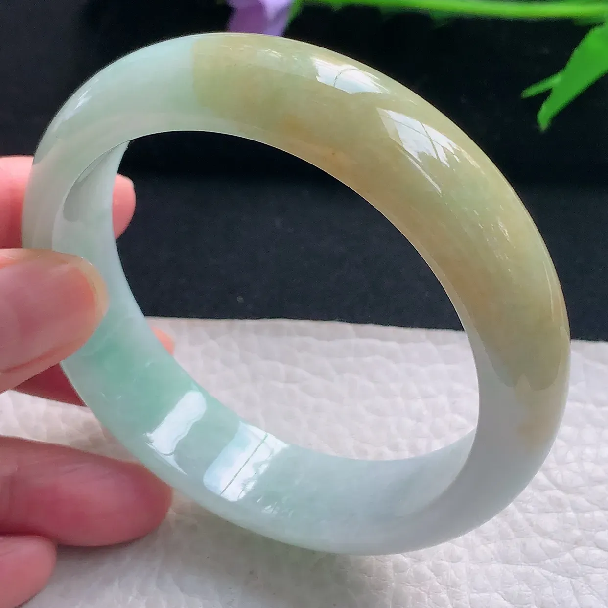 z大圈口60*16.3*8.3轮胎镯 老坑天然翡翠黄加绿宽边玉手镯 珠宝玉手环