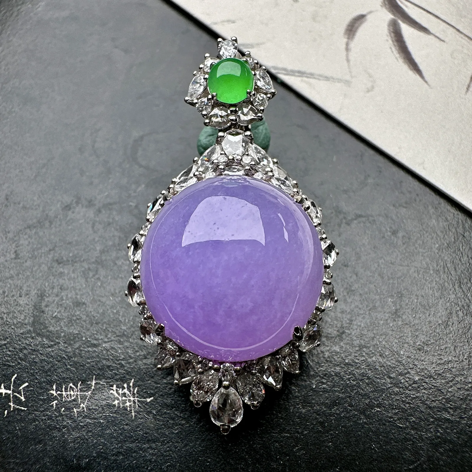 【冰种紫蛋面吊坠】种水很不错、细腻水润,形状很饱满,收藏品质,18K金钻镶嵌,裸石尺寸17.8*11