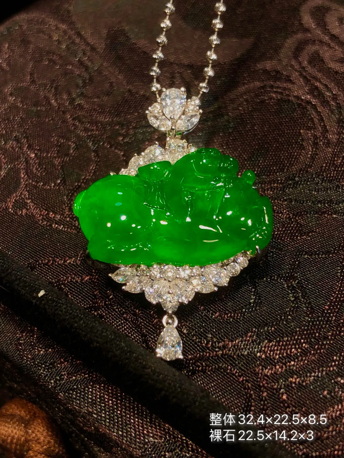 ️缅甸高冰帝王绿唐马吊坠 满色均匀,种老通透,搭配闪耀的天然钻石镶嵌更显时尚,雕工精湛马背上有元
