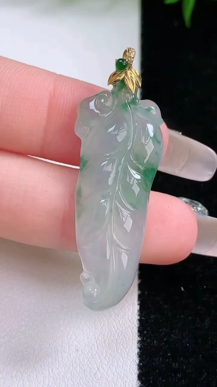 天然A货翡翠18K金飘花金枝玉叶 叶子吊坠,尺寸37.6-14.2-4.5,重量:4.95g 3月4