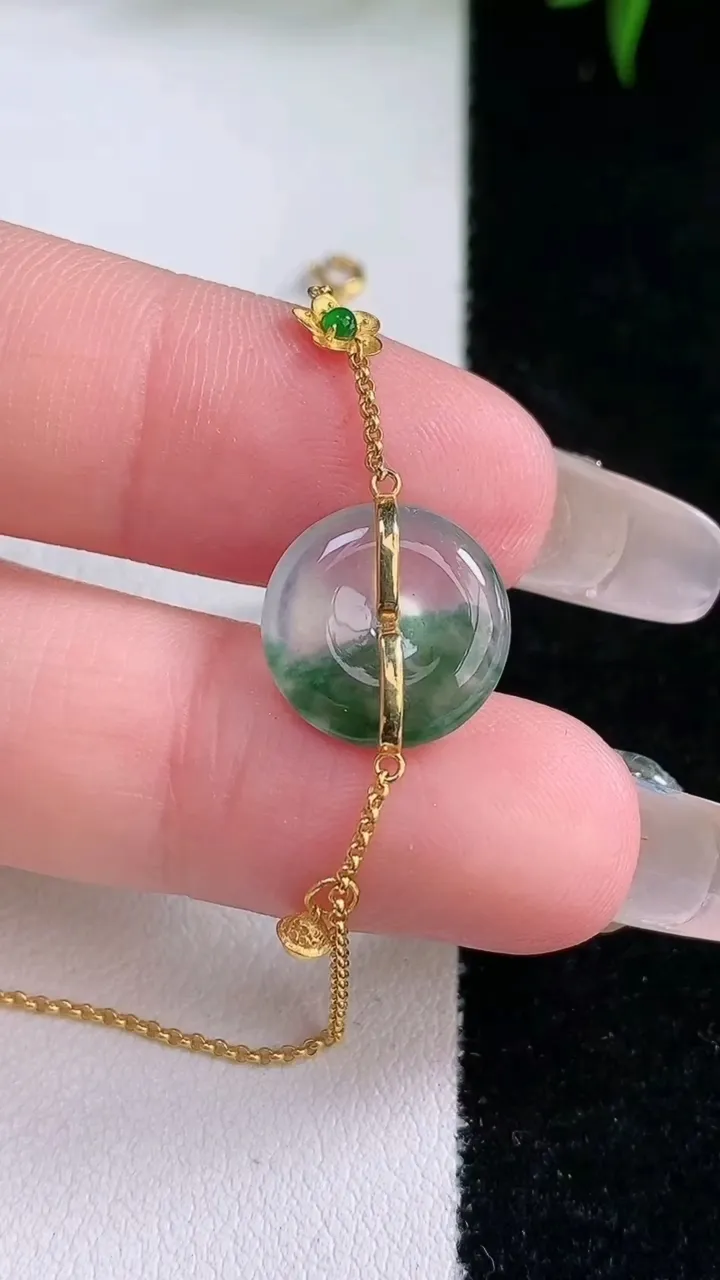 秒杀【超低价放漏】18K金伴钻镶嵌满绿平安扣吊坠,翡翠平安扣,水润光泽,寓意平平安安,平安扣佩戴上身效果端庄漂亮!#00.15整体长33裸石26.5*9.5