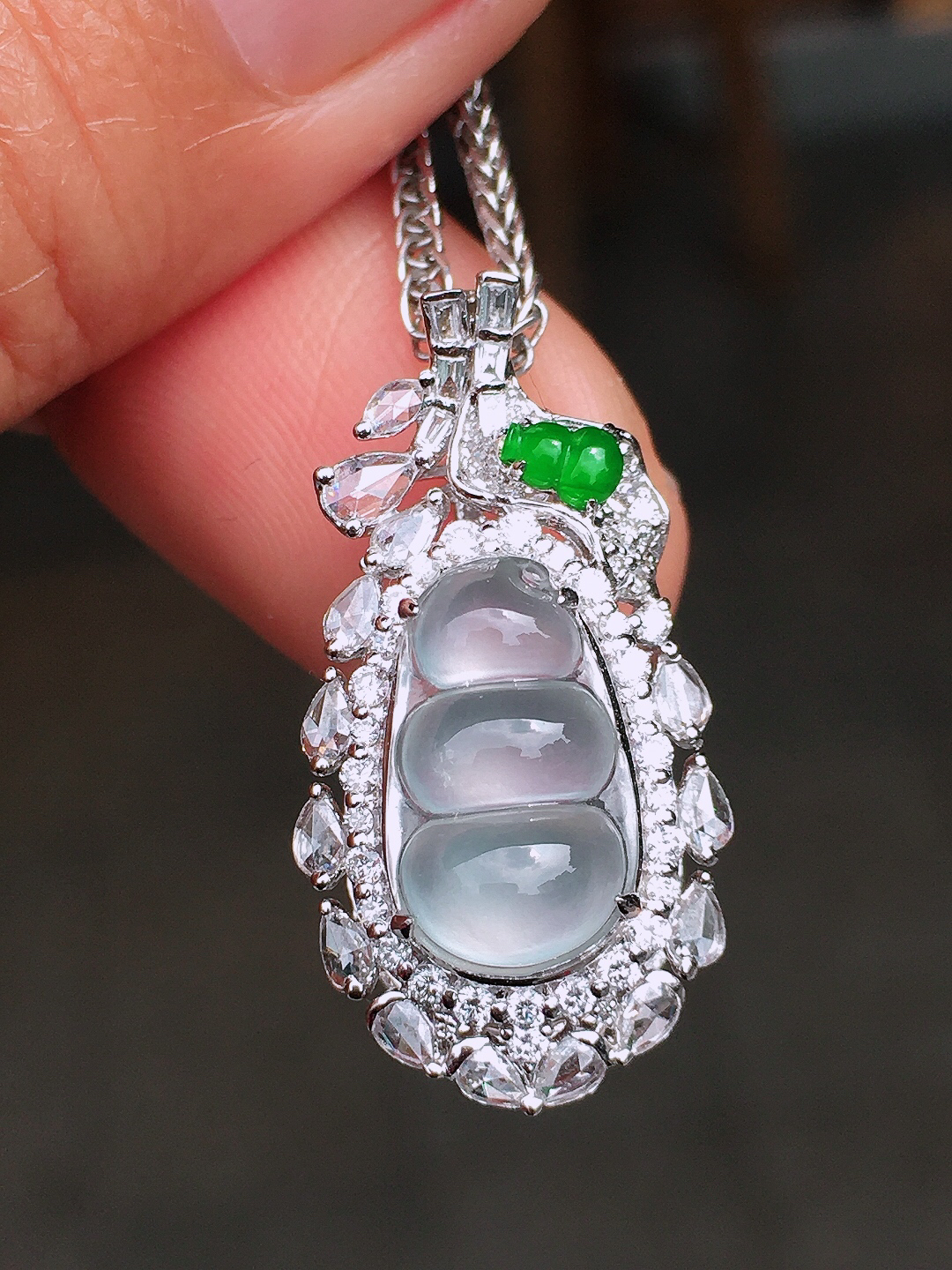 玻璃种福豆吊坠,玉质细腻,荧光感超 强,饱满圆润,尽显优雅气质,18k 金豪华镶嵌