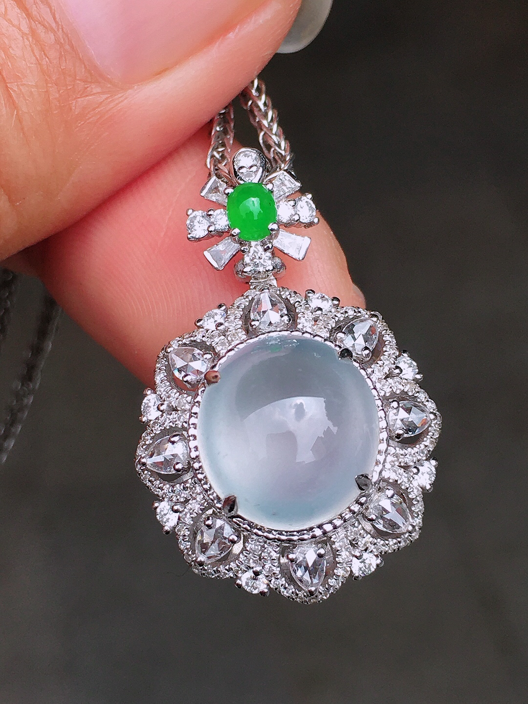 冰种蛋面吊坠,玉质细腻,荧光感超 强,饱满圆润,尽显优雅气质,18k 金豪华镶嵌