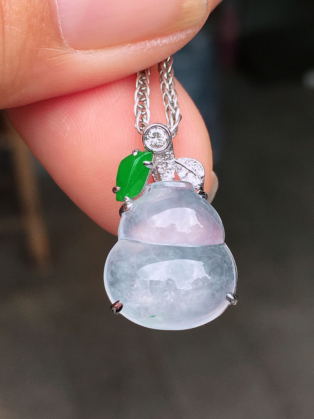 冰种葫芦吊坠,玉质细腻,荧光感超 强,饱满圆润,尽显优雅气质,18k 金豪华镶嵌