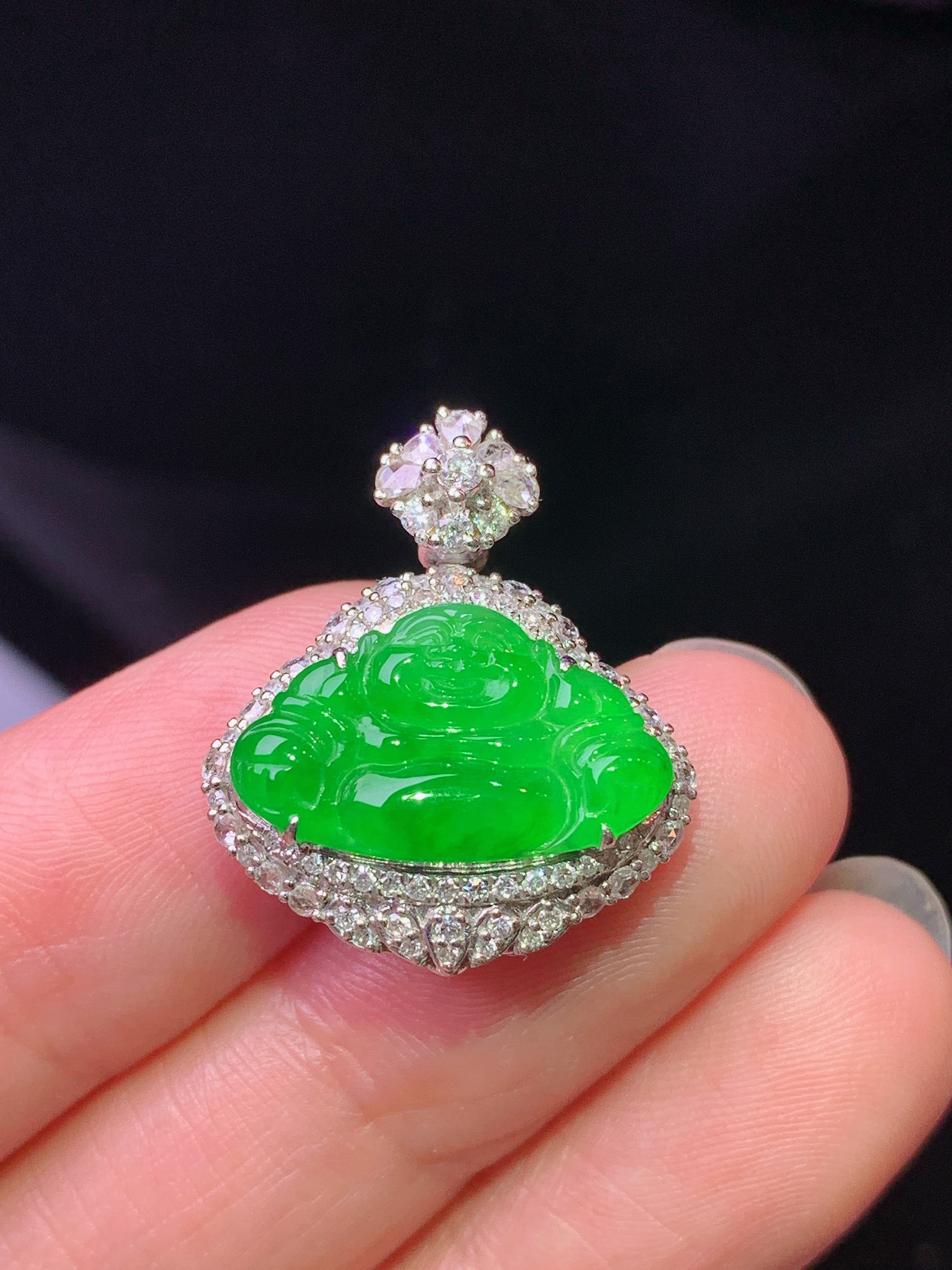 18k金钻镶嵌阳绿佛公吊坠 玉质细腻 色泽艳丽清新 水润亮眼 整体尺寸25.3*23.3*9.5s2