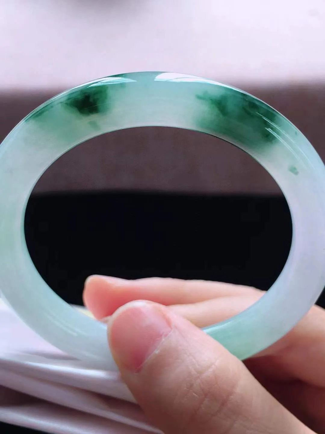 【翡翠名称】老种冰飘花52.2圈口圆条手镯 【翡翠尺寸】52.2*9*8.6mm适合52-54.5正