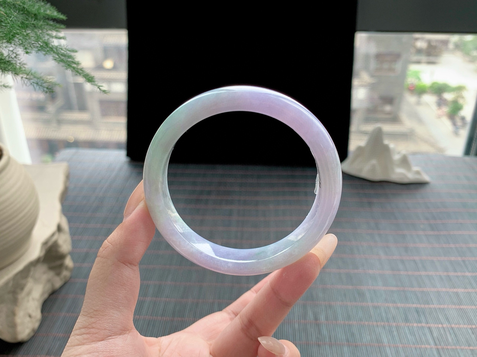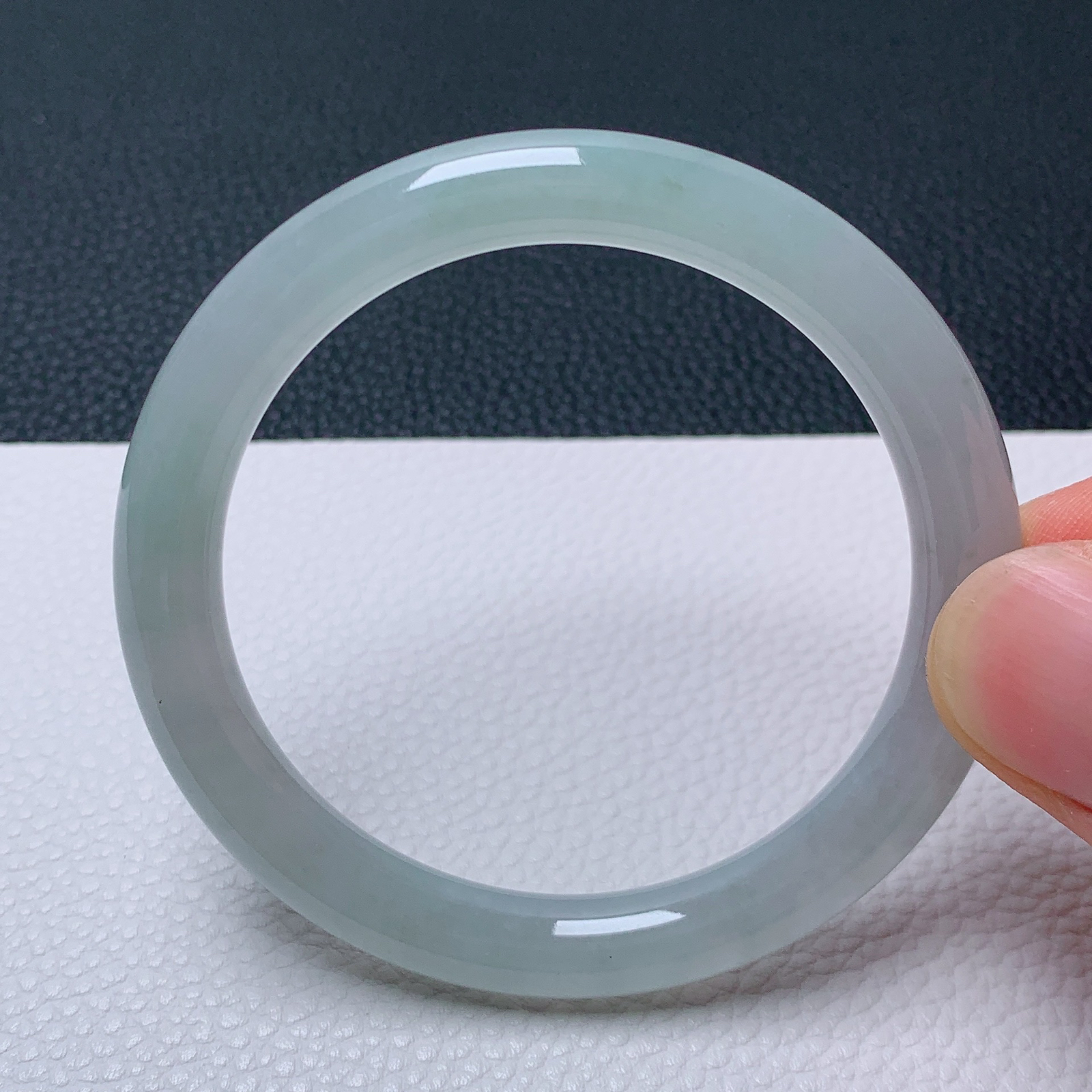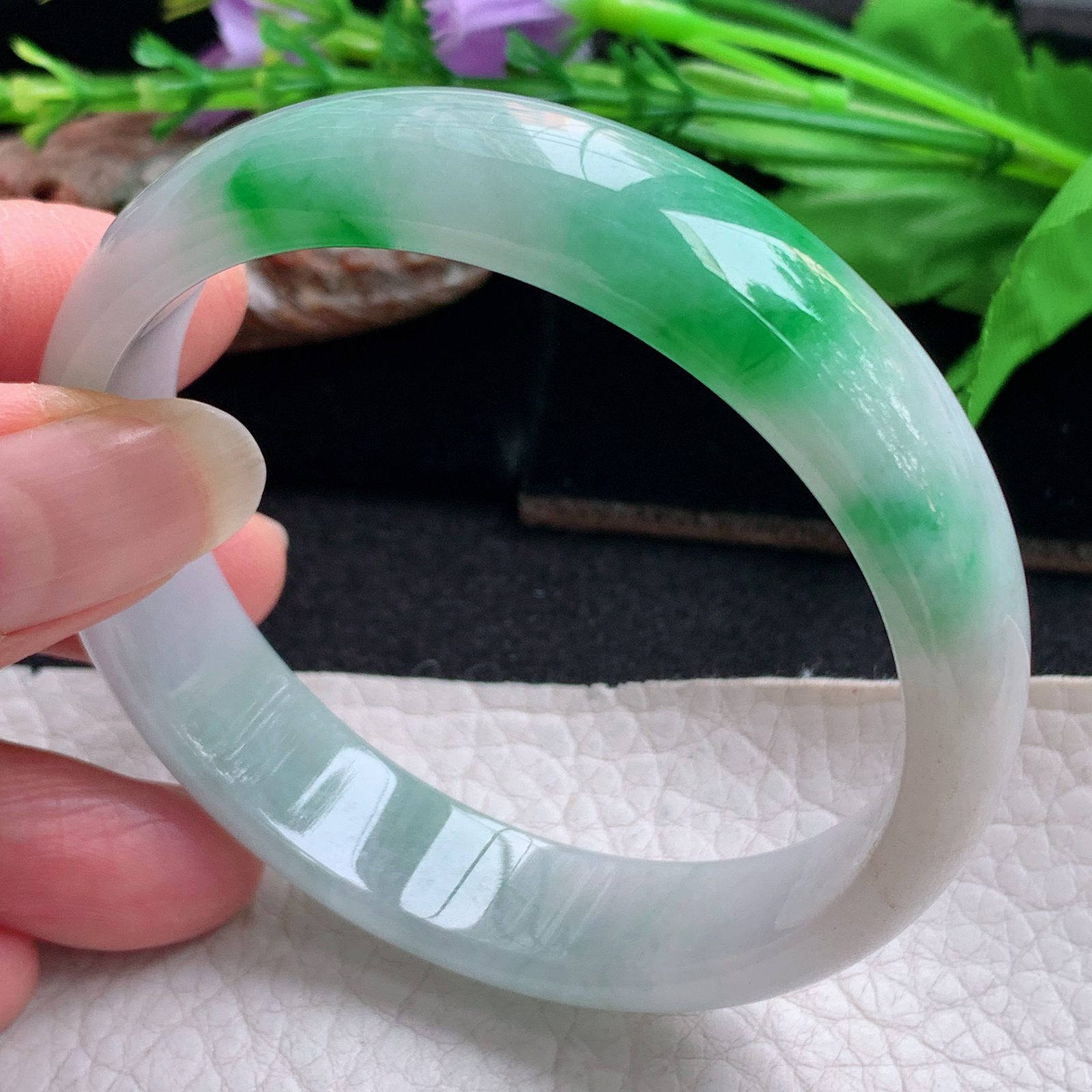 58.5/11.5飘绿圆条,翠色鲜艳夺目,珠圆玉润,传世之翠,一眼入魂。棉线纹