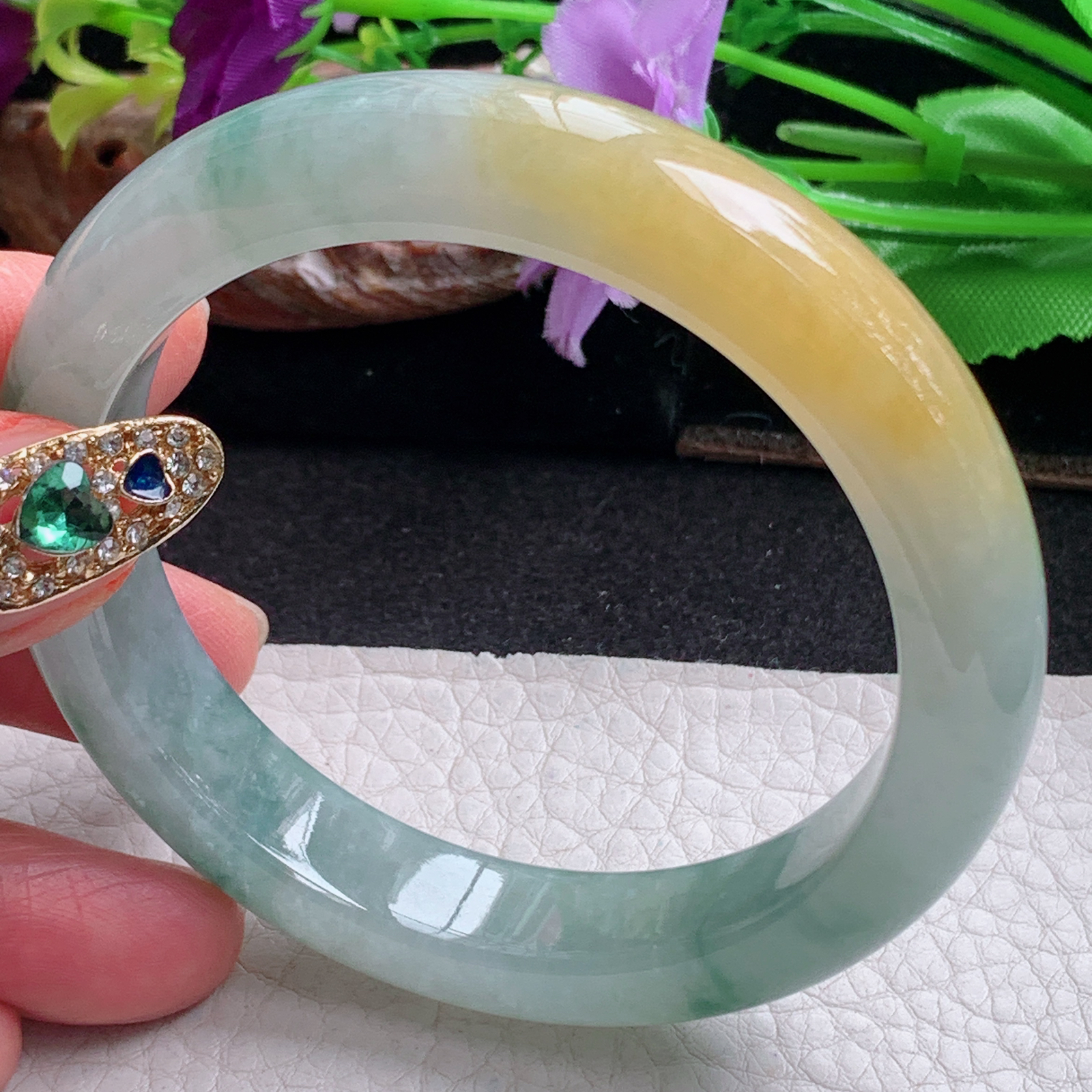 A货天然翡翠冰糯种黄飘花手镯59圈重量50.66 4月3日