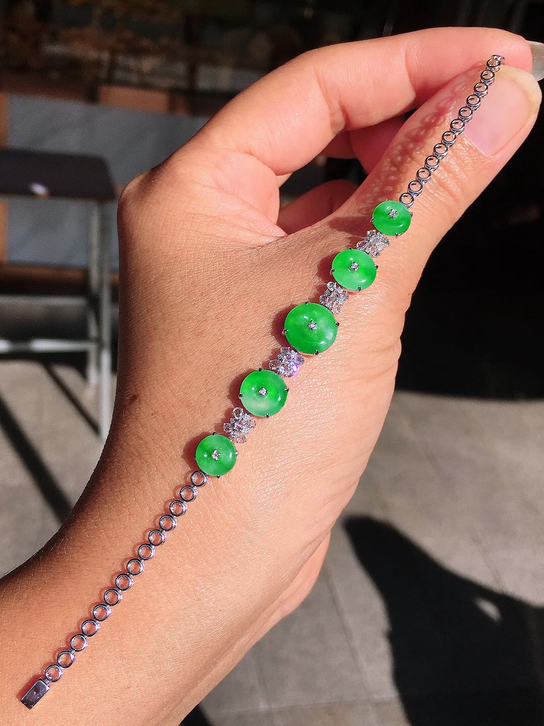 阳绿平安扣手链,色泽均匀艳丽,玉质细腻,荧光感超 强,饱满圆润,尽显优雅气质,18k 金豪华镶嵌