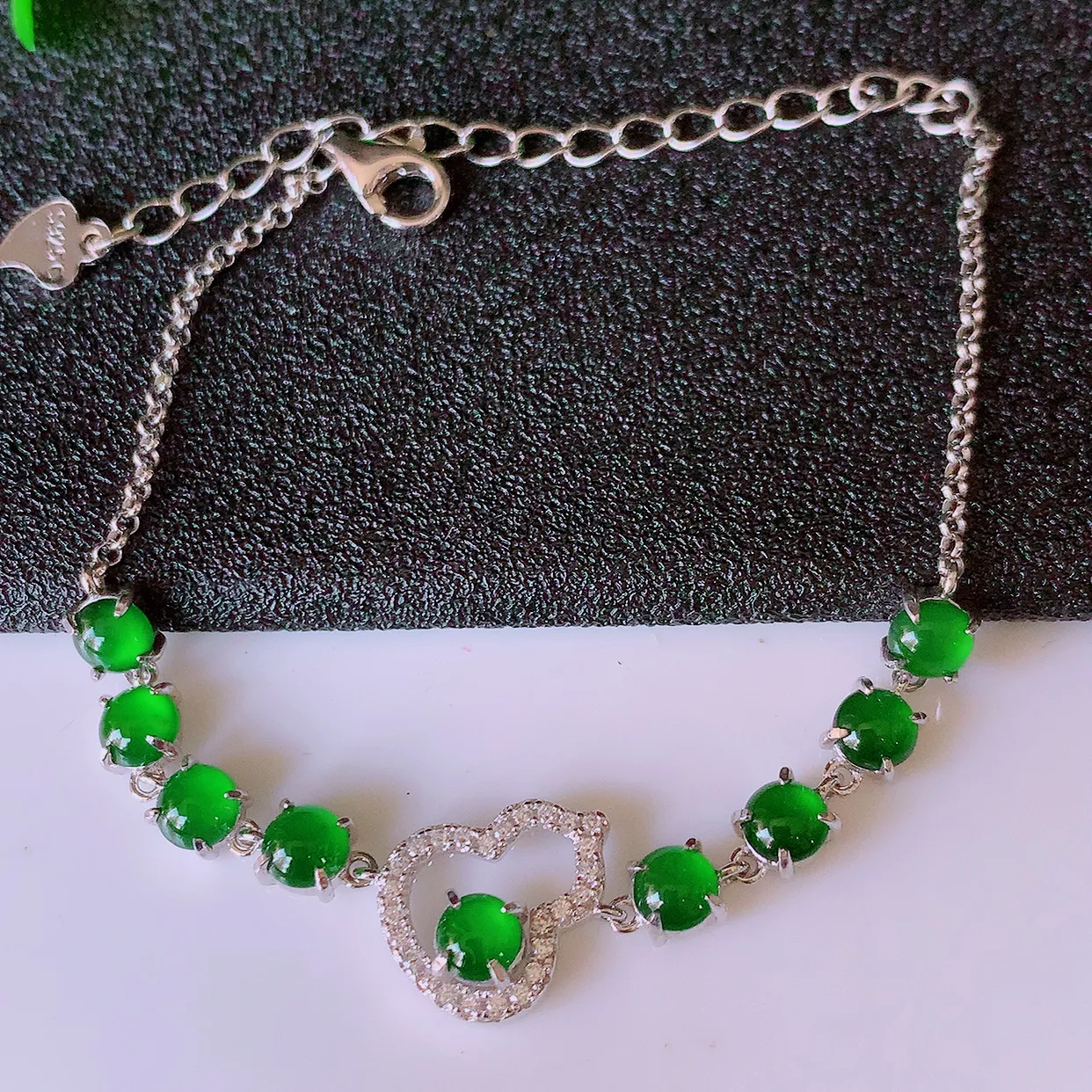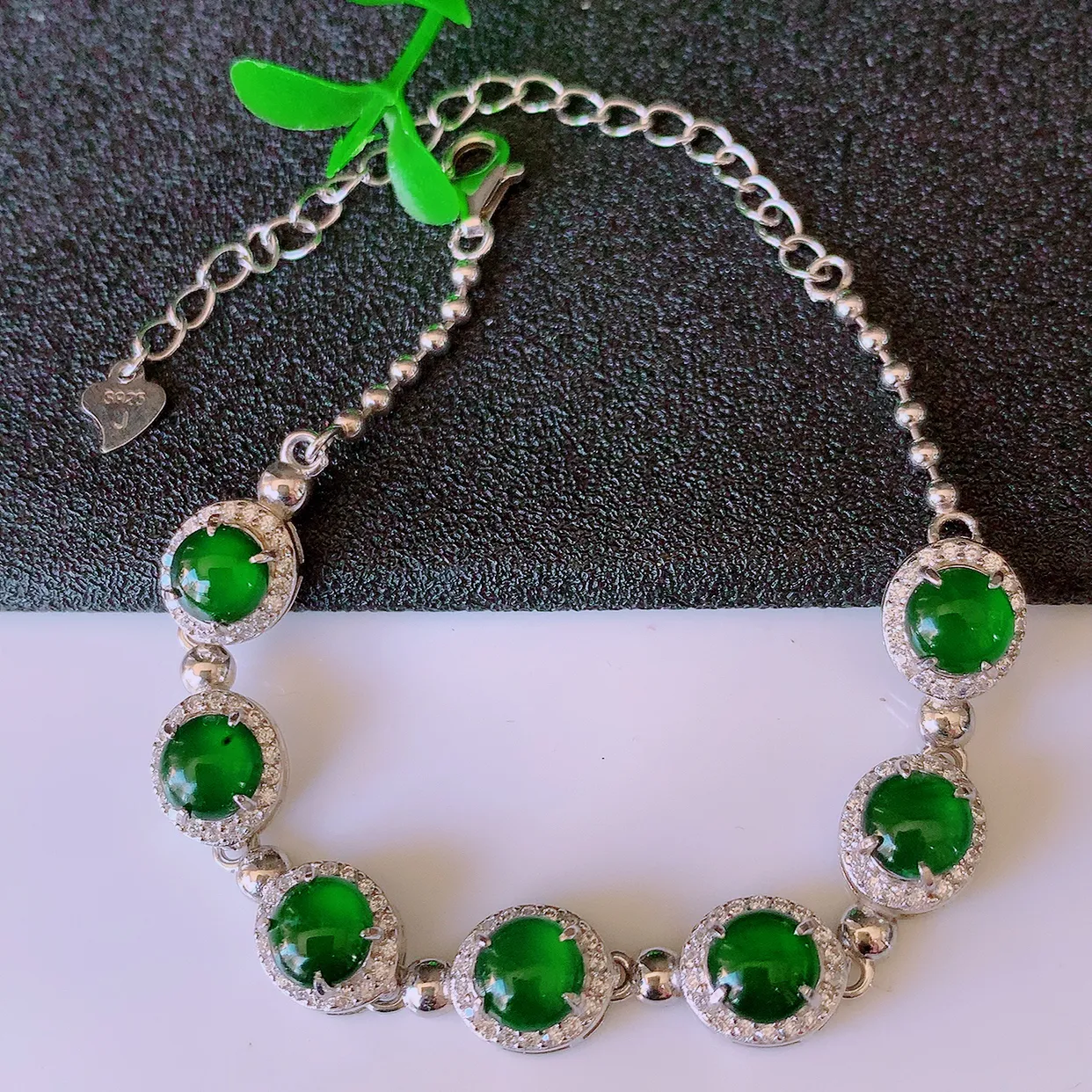 冰透满绿翡翠925银镶嵌手链,自然光实拍,翠色灵动,颜色漂亮,种老水足,品相佳,佩戴佳品!#97.1